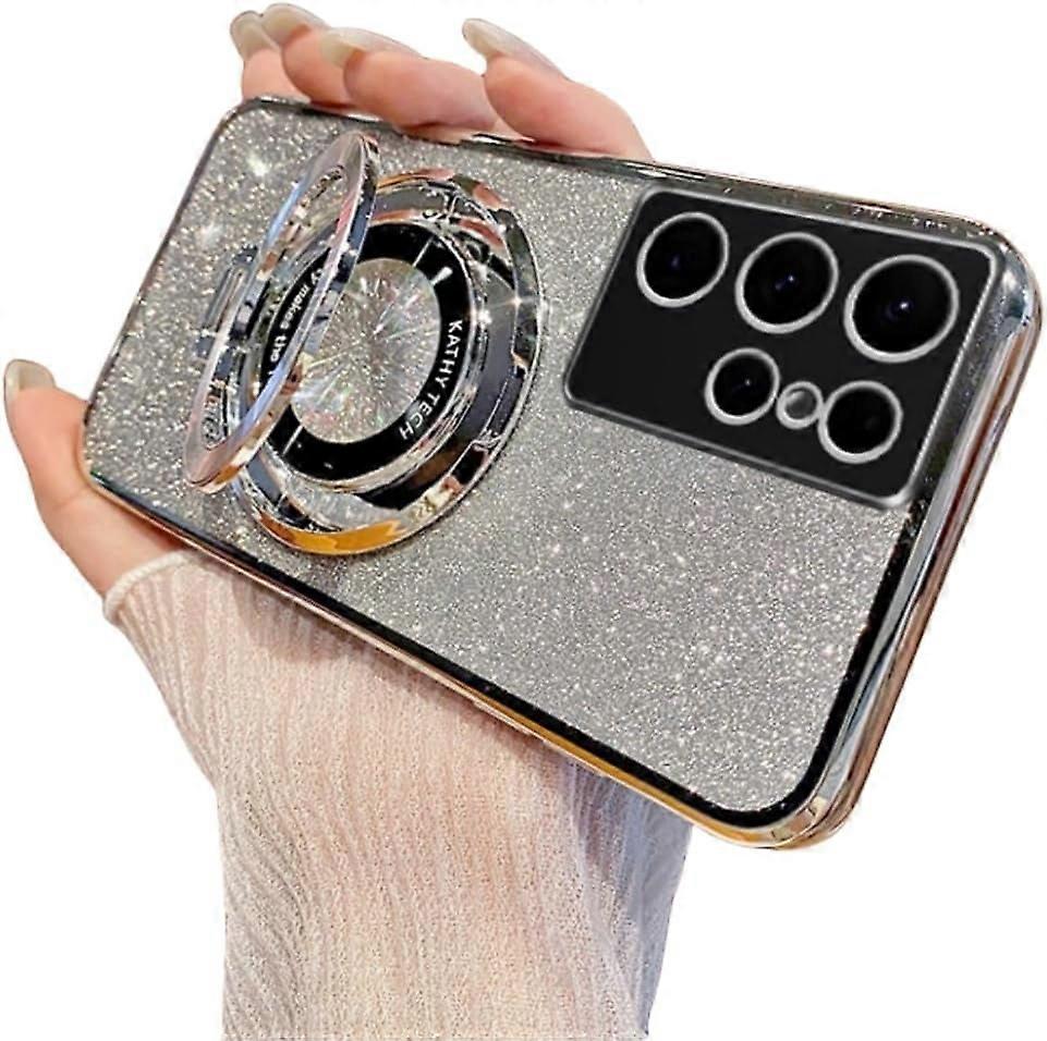 Gradient Electroplating Glitter Phone Case with Hidden Finger Ring Holder for Samsung Galaxy S24/S23/S22/S21/S10/ULTRA/PLUS/FE (Silver)