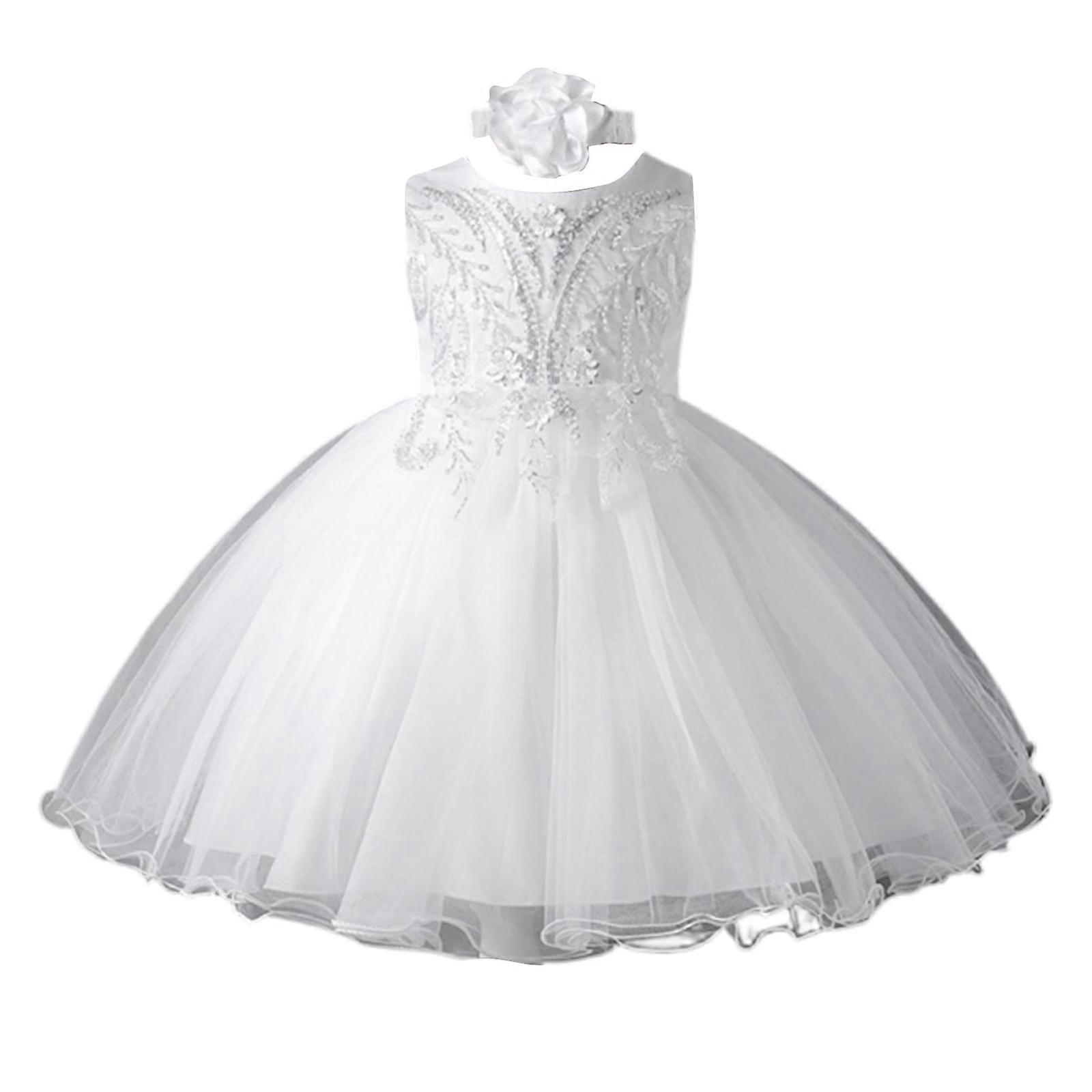 Girls' Sleeveless Tulle Princess Gown with Floral Embroidery & Headband – Birthday, Wedding, Special Occasion Dress Up (White, Size 60, Ages 4-6)
