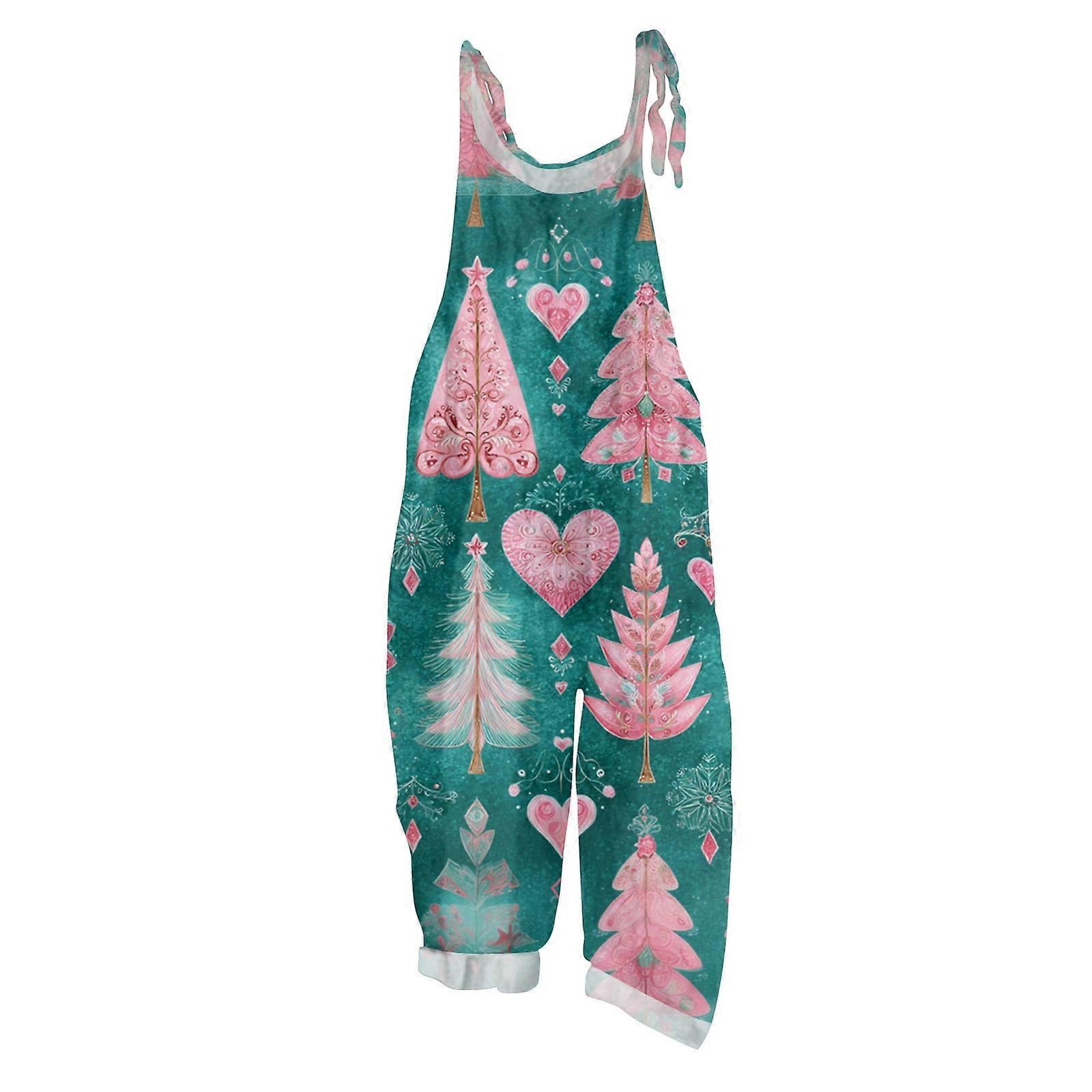 Women's Vintage Cotton Linen Overalls with Christmas Print - Casual Loose Jumpsuit with Shoulder Straps & Pockets, Turquoise, Size M