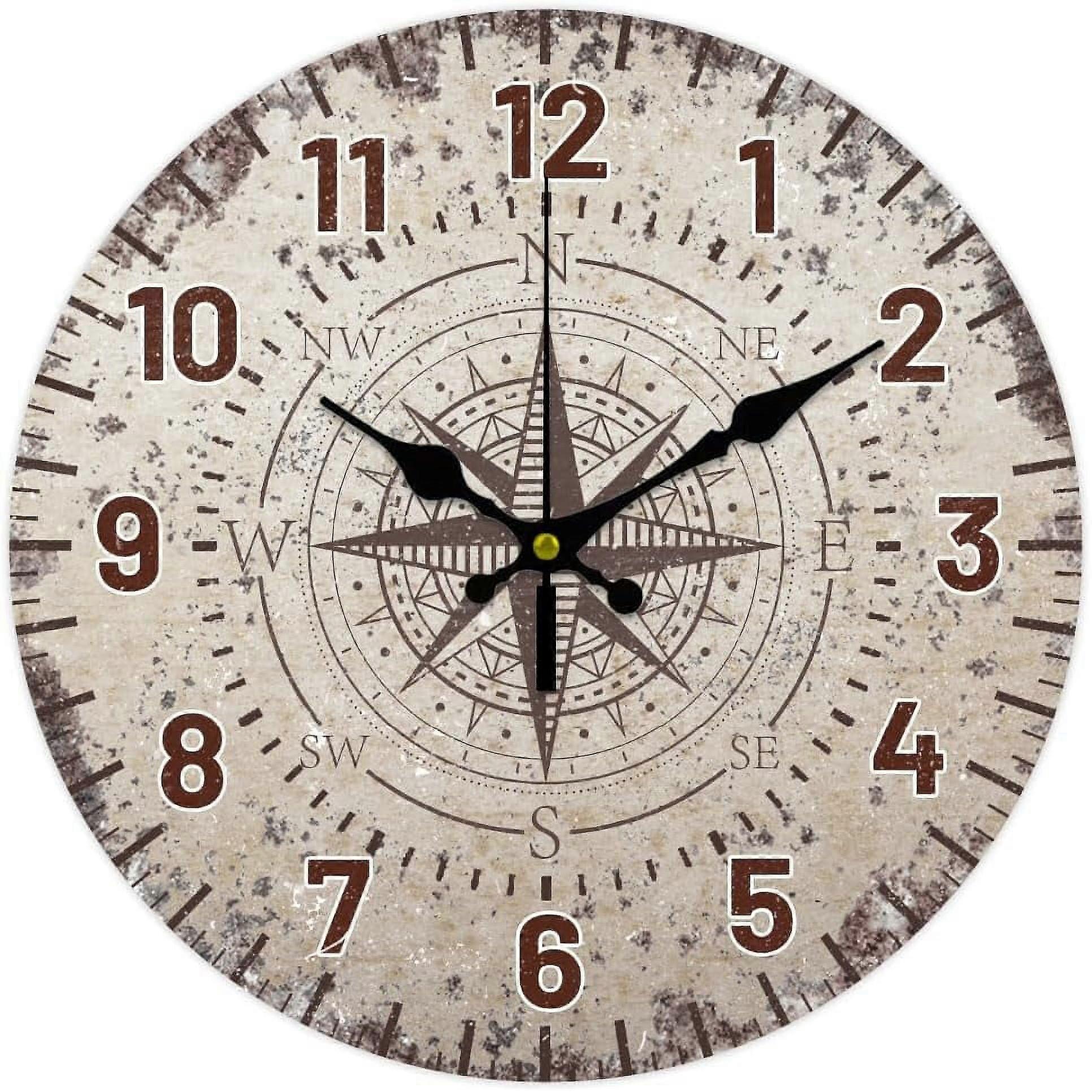 12" Vintage Nautical Compass Wall Clock, Silent Wooden Round Battery Clock for Home, Living Room, Kitchen, Office Decor