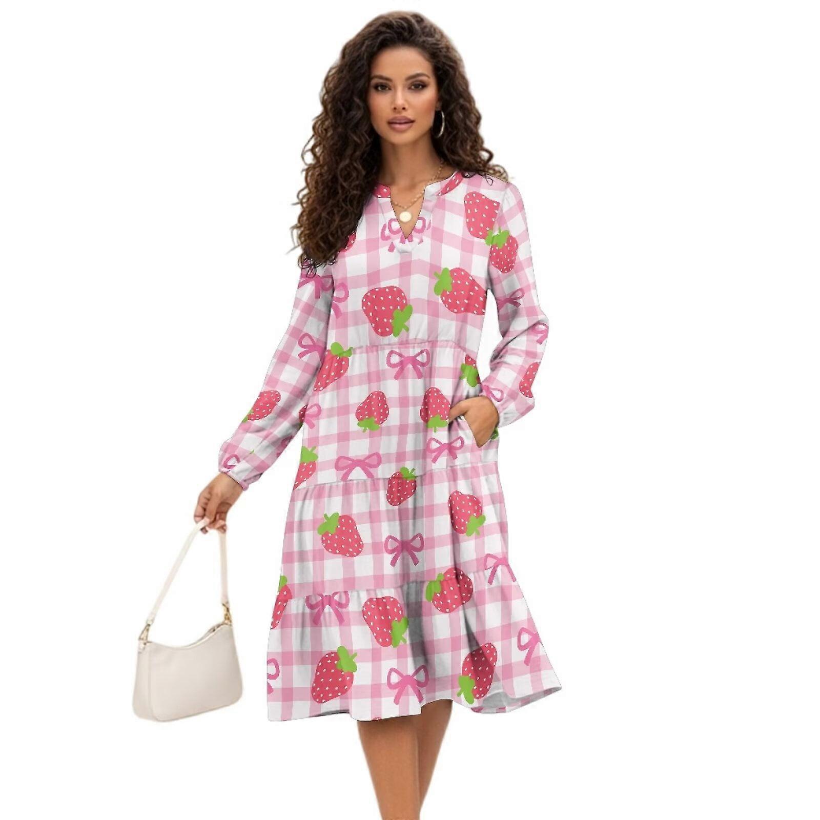 Dress for Women Casual Flowy Cozy Long Sleeve Fashion Dress Size XL Elegant Lightweight Patchwork Workwear V-Neck, Pink Strawberry