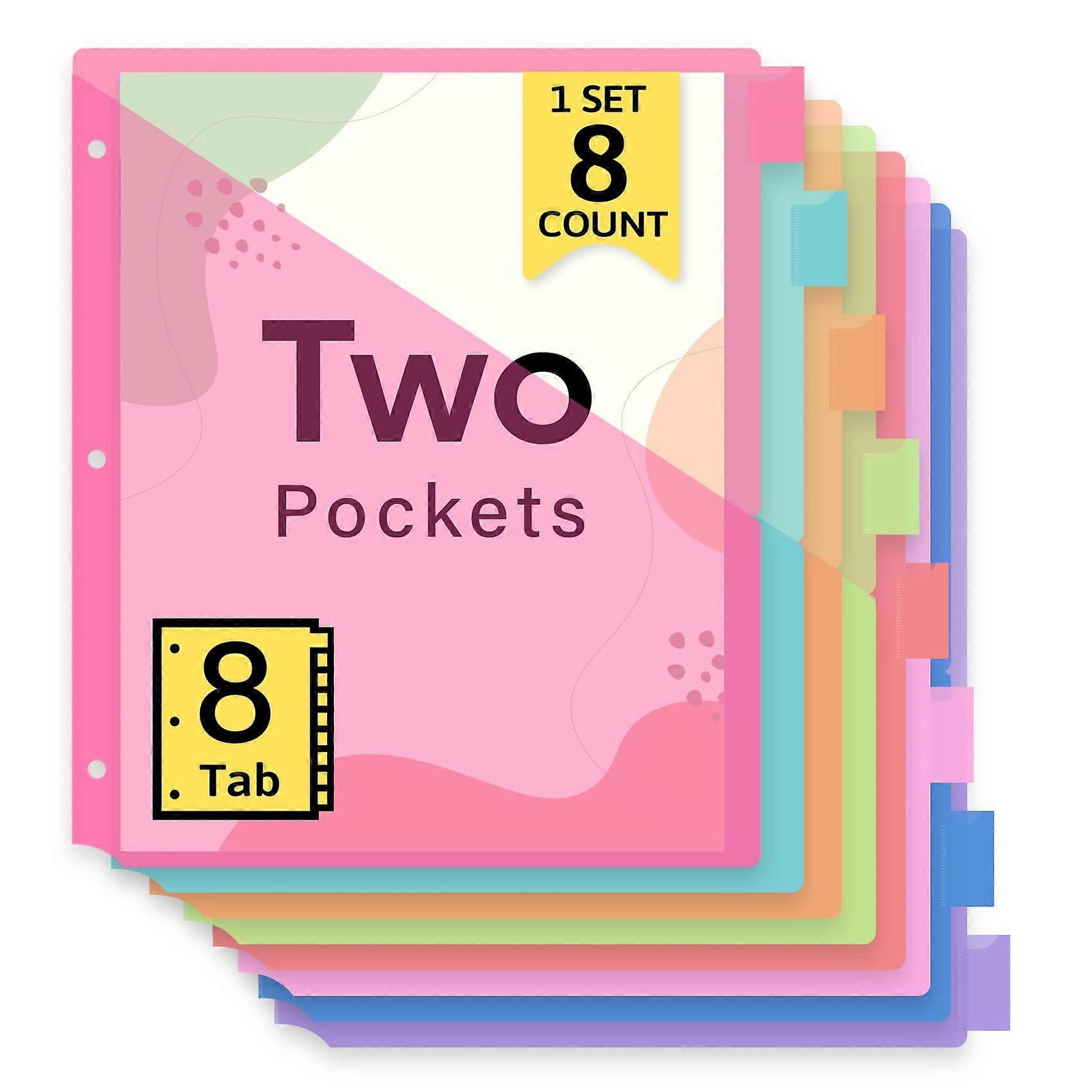Stay Organized With Our 8-Tab Binder Dividers – The Ultimate & Office Companion Keeping documents sorted and easily accessible has never been easier with our 8 plastic tab dividers for 3-ring binders, designed for efficiency and durability. Each divider includes two spacious pockets, perfect for storing handouts, notes, and worksheets securely. Whether you're a juggling multiple subjects or an office professional managing projects, these dividers ensure everything stays neatly in place. Customizable For Your Needs The writable blank labels allow you to personalize each tab with a pen or pencil, making it simple to categorize subjects, projects, or files. Need to reorganize? Just erase and rewrite—no wasted labels or messy stickers. The pastel-colored tabs provide quick visual identification, so you can flip to the right section instantly, saving time during study sessions or meetings. Built To Last With Heavy-Duty Plastic Made from tear-resistant, waterproof material, these dividers protect your documents from spills and daily wear. The reinforced edges prevent bending and tearing, ensuring they stay intact even with frequent use. Unlike flimsy paper dividers, these plastic tabs maintain their shape, making them a long-term solution for binder organization. Perfect Fit For Standard Binders Measuring 8.5" x 11" with 3 pre-punched holes, these dividers slide effortlessly into any standard 3-ring binder. The smooth-gliding design ensures pages turn easily, while the secure fit prevents them from slipping out. Whether you're using them for notes, work reports, or personal planning, they enhance your binder’s functionality. Ideal For s, Teachers & Professionals These dividers are a must-have for: s – Organize class notes, assignments, and study guides by subject Teachers – Sort lesson plans, handouts, and grading sheets Office Workers – Manage project files, reports, and meeting materials Home Users – Keep household documents, recipes, or planners in order Upgrade your organization game with these multicolor plastic tab dividers—order yours today and experience hassle-free document management! Efficient Organization With 8 Tabs And Two Pockets: Each divider includes two spacious pockets, perfect for storing handouts, notes, and worksheets. Keep your binder neat while ensuring quick access to essential documents, ideal for s, teachers, and professionals who need a clutter-free workspace. Customizable Writable Labels For Personalization: Featuring blank white labels, these dividers allow you to write and rewrite section names with ease using a pen or pencil. Personalize your binder for quick reference, making document retrieval faster during study sessions or meetings. Color-Coded Tabs For Instant Navigation: The vibrant pastel-colored tabs help you locate sections effortlessly, saving time when flipping through documents. Perfect for busy s, office workers, or anyone who values efficiency in organizing study materials or project files. Durable Heavy-Duty Plastic Construction: Made from tear-resistant, waterproof plastic, these dividers withstand daily wear and tear while protecting documents from spills. The reinforced edges ensure long-lasting durability, making them a reliable choice for repeated use. Universal Letter Size With Pre-Punched Holes: Sized at 8.5" x 11" with 3 pre-punched holes, these dividers fit seamlessly into standard 3-ring binders. They slide in smoothly and stay securely in place, enhancing your binder setup for better document management.