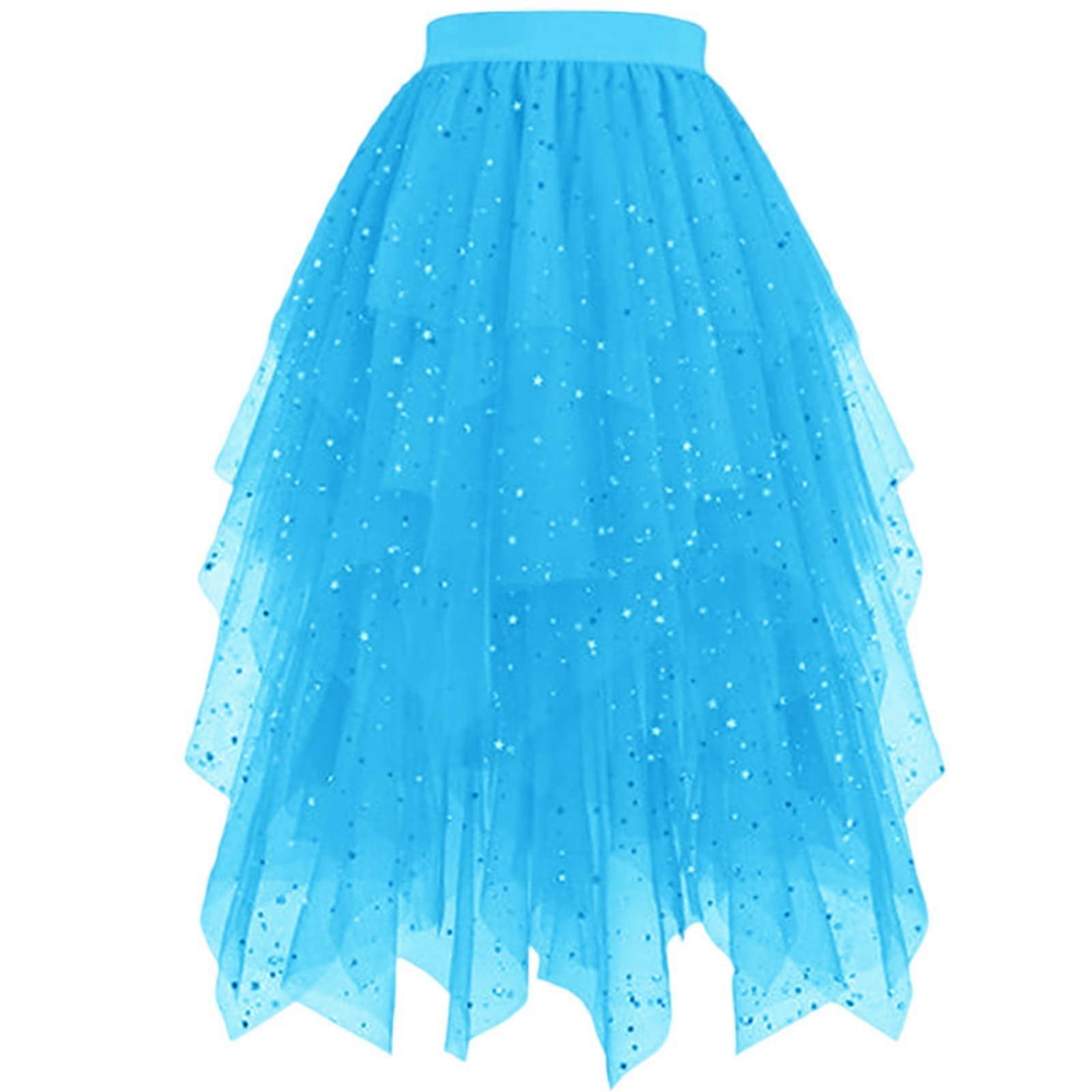 Women's Asymmetrical Star Print Tulle Sequin Puff Midi Skirt Blue XL