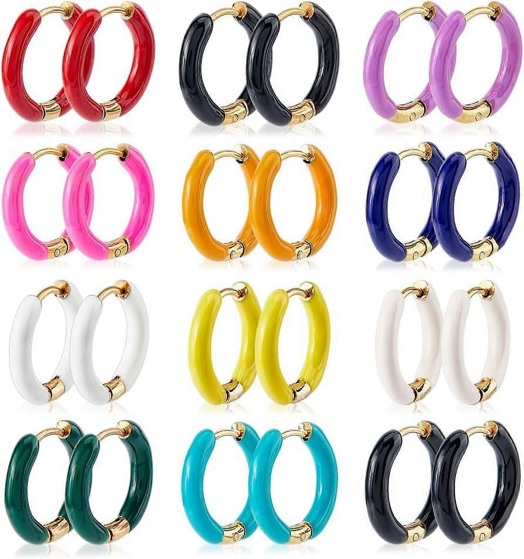 24Pcs 12 Colors Enamel Huggie Hoop Earrings, 12mm Golden Stainless Steel, Cute Statement Earrings Set