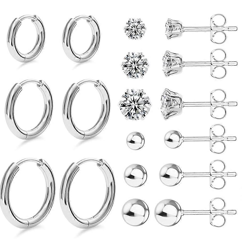 10 Pairs 316L Stainless Steel Hoop Earrings Cubic Zirconia Stud Earring Round Ball Stud Earring for Women Men, Silver