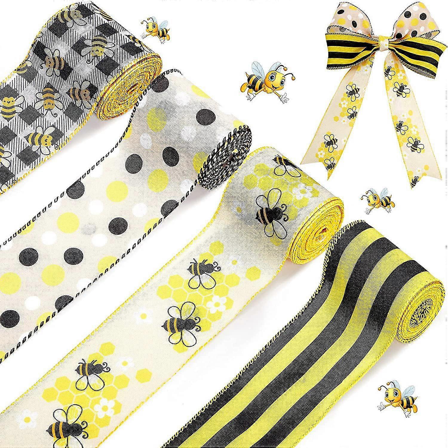 5 Yard Bumble Bee Fabric Burlap Ribbon Yellow Black Dots Plaid Strip Wired Edge Ribbon Summer Fabric Craft Decorative Ribbon for Gift Wrapping Birthday Party Decor Hair Bow Sewing Specifications: Material: Polyester Size: 5 Yards x 2.5 Inches Features: DURABLE MATERIAL: Ribbons are made of quality polyester fabric,soft,colorful and not easy to wear. GOOD DESIGN: The well made design and long size can suffice your needs for decorative needs or replacement. PROPER SIZE: Each roll measures 5 yards, and 2.5 inch in width, long enough to to make kinds of crafts for Summer Day, and can be cut into the proper size you need. WIDE RANGE OF USE: They can be used as gift wrapping ribbon, or for making floral bows, wreath bow to decorate your farmhouse, garland, staircase, trees, gift baskets, enhancing the joyful festive atmosphere. Package Included: 1pc x Fabric Ribbon Note: 1. Due to the light and screen difference, the item's color may be slightly different from the pictures. 2. Please allow 0.5-2 cm differences due to manual measurement. Designed in summer theme, bright and eye-catching,making your life more interesting Each roll measures approx. 2.5 inches in width and 5 yards in length, totally 20 yards, enough to meet your long time use and satisfy your DIY and decoration demands Made of reliable polyester material, hard to break or tear Suitable for decorating your handcrafts, such as bows, wreaths, bouquets, trees, chairs, garlands and gifts Suitable for different occasionssuch as summer holiday parties, birthday parties, gift wrapping,wedding and more
