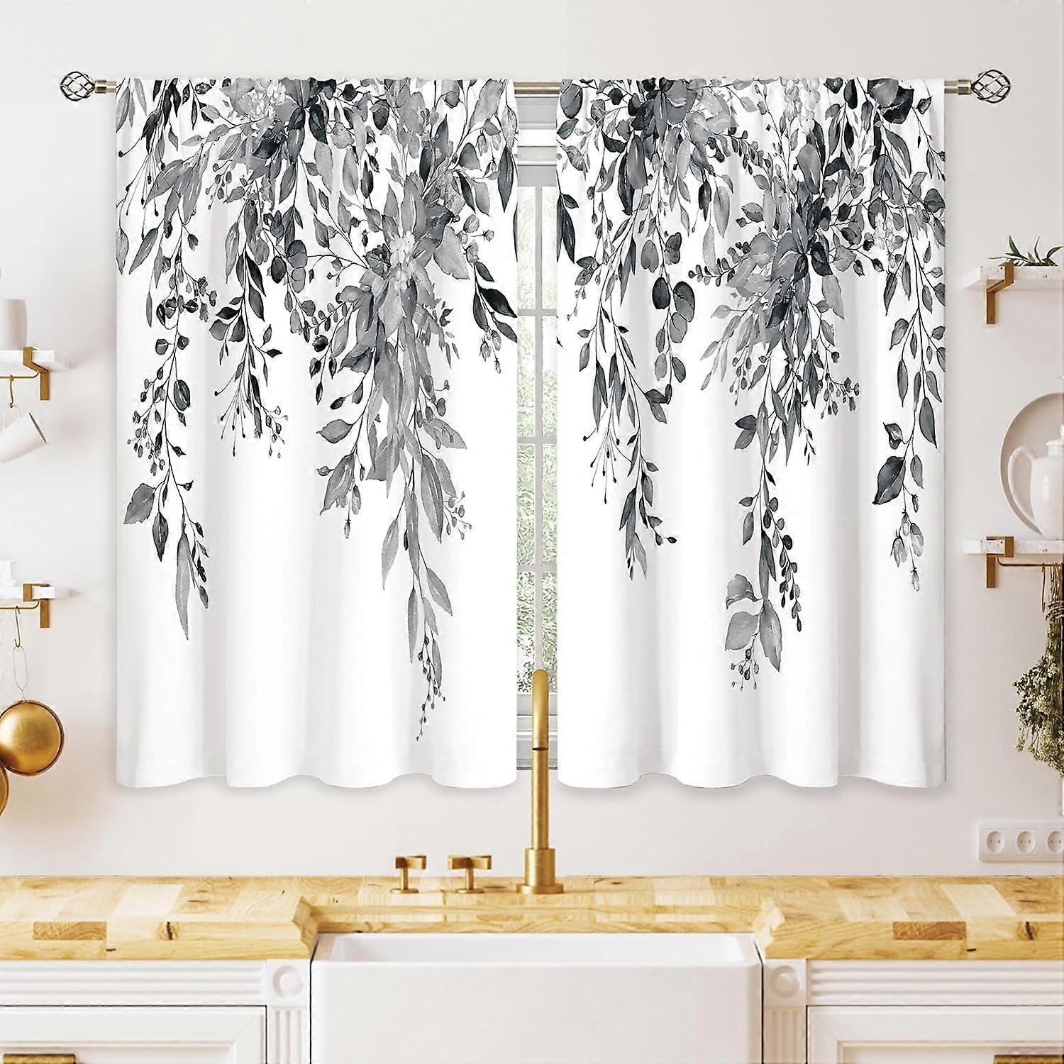 Eucalyptus Botanical Grey Floral Kitchen Curtains, 26x24 in, Farmhouse Tier Drapes for Sink, Bathroom & Cafe Windows