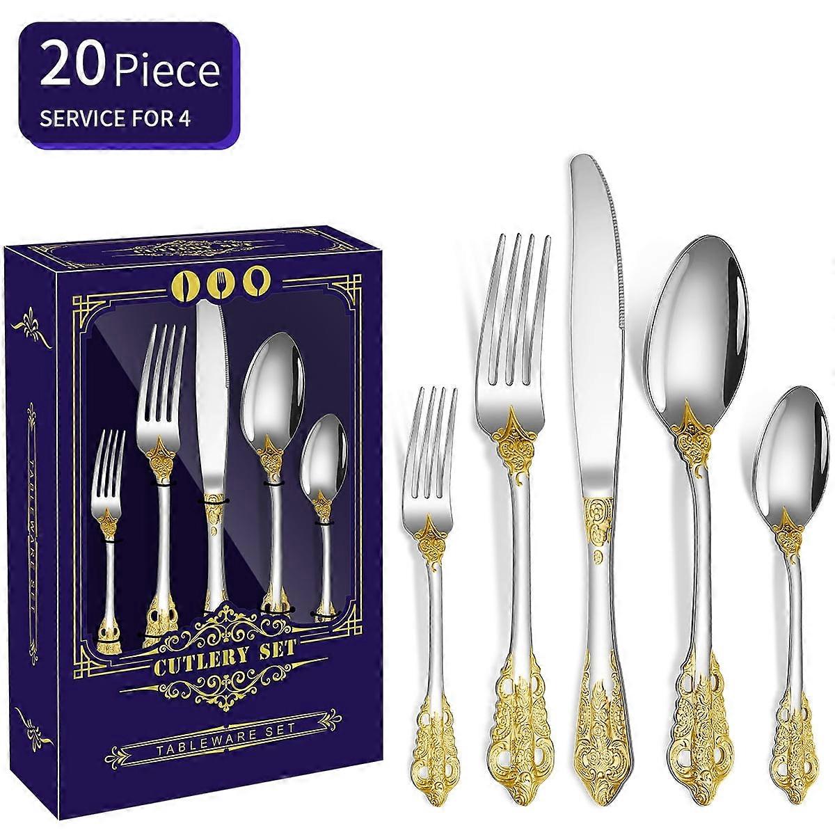 Luxury 20 Pieces Stainless Steel Flatware set, Service for 4, Mirror Polished with Gold Accents, Fine Silverware set and Dishwasher Safe