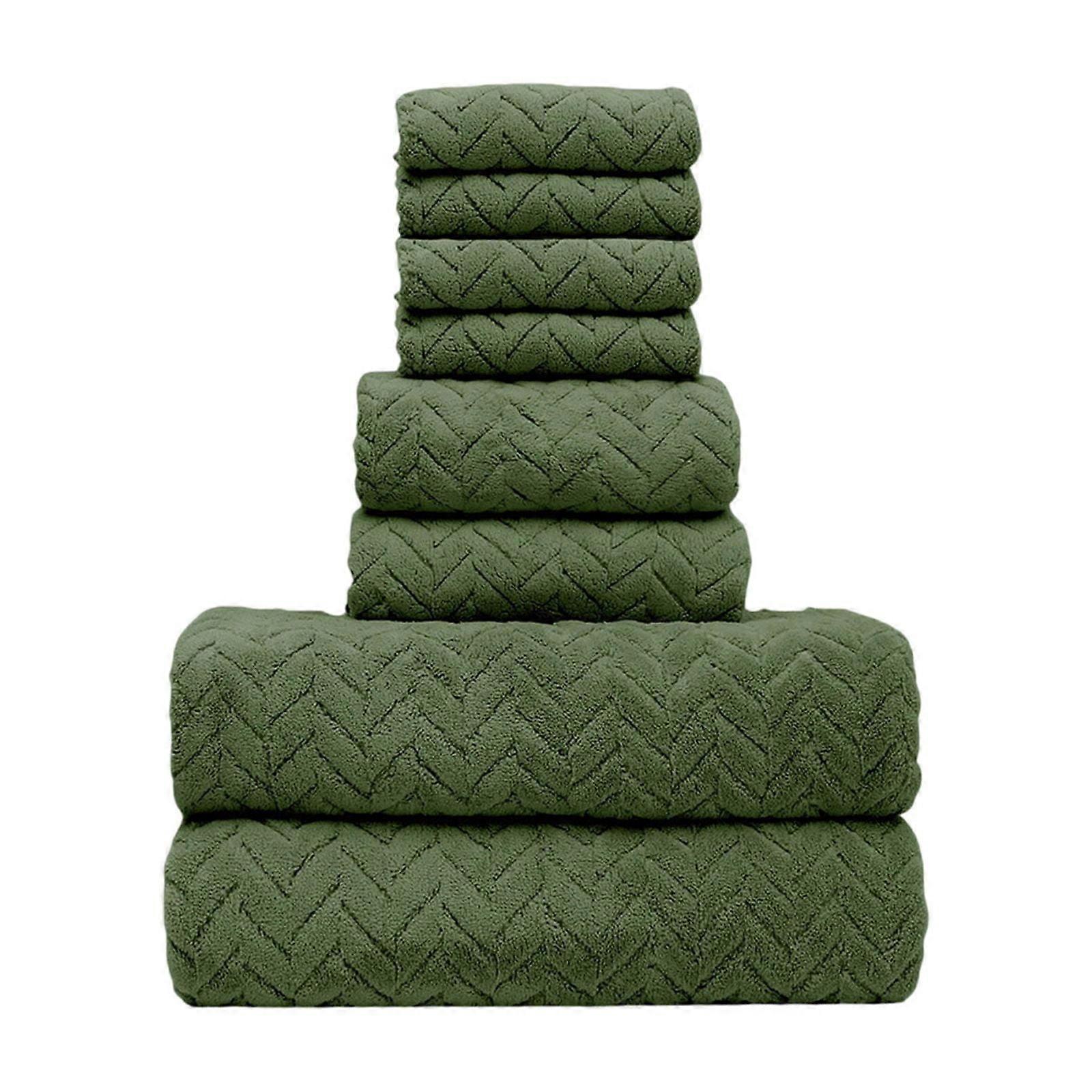 Eight Pieces Of Velvet Square Towel Towel Bath Towel Plain Household Bath Wash Face Wipe Dry Absorbent Soft Household Set Product Description: Feature: Quantity: 8pc Color: A-rmy Green Material: cotton Product Size: square towels:30x30cm/11.81x11.81in,washcloths:35x75 cm/13.78x29.53in,bath towels:70x140cm/27.56x55.12in Package size: 36x25x9 cm/14.17x9.84x3.54 in N ET weight: square towels:25g/0.05lb,washcloths:80g/0.17lb,bath towels:290g/0.63lb Gross weight: 851 g/1.88 lb Product Description: PUREST FEELING : At the end of a long day or at the beginning of, you deserve a touching of. Turn your home into center of historic interest and your bathroom into a mini spa with the help of white classic soft and comfortable elegant towels. Available in a variety of colors, make your bedroom feel like you're in a magazine. EXPERIENCE FEELING: Experience the super softness of true with every use. The face is smoothness, non-shedding and durability. The edges are reinforced with double needle embroidery stitching to against wear and tear from long term use and washing. Easy to clean: just put them in the washing machine. After the first wash, the towels will be nice and unkempt and feel fresh and soft. These towels have been specially treated to reduce drying, thus saving and energy costs. Keep the lint filter clean. You may find some lint in the first wash. This will not affect the look, feel or performance of the towels. Super absorbent performance: Thanks to the unique fiber structure of fleece, this Bath towel has excellent water absorption and drying. Whether it is gently wiped after bathing or daily use, it can quickly absorb water, keep the dermatological dry and comfortable, and avoid catching a cold. Durablely and thickened design: We are well aware of the importance of quality, so we specially use thickening technology to ensure that the Bath towel is more durablely. Even after multiple washings and long term use, it can still remain puffy and soft, not easy to deform or awning, and extend its service life. Solid color and foolproof style: The solid color is foolproof and generous, and it is easy to match various home styles. Whether it is modern and foolproof style or warm rural style, it can be easily integrated, adding a TACTILES of freshness and graceful to your living space. Ear hanging design: In order to facilitate hanging and storage, this Bath towel is specially equipped with an ear hanging. You can easily hang it in the bathroom, balcony or anywhere you want, which saves space and is convenient for right of use, making your home life more organized. Package Content: 4x square towels, 2 bath towels, 2x washcloths 8-Piece Bath Towel Set, Ultra Soft & Absorbent - Includes 4 Square Towels, 2 Bath Towels & 2 Washcloths for Bathroom Spa Hotel Home Use, Army Green 8-Piece Bath Towel Set towels for bathroom bath towels large Home Decor
