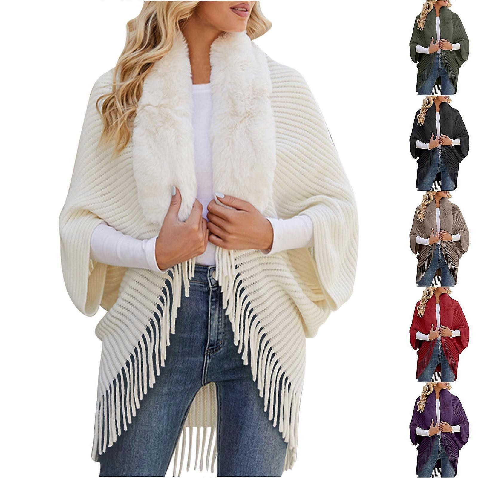 Fashion Womens Knitted Cape Coat with Fur-Collar Fringe Shawl Knit Poncho Coat Cardigan,Black
