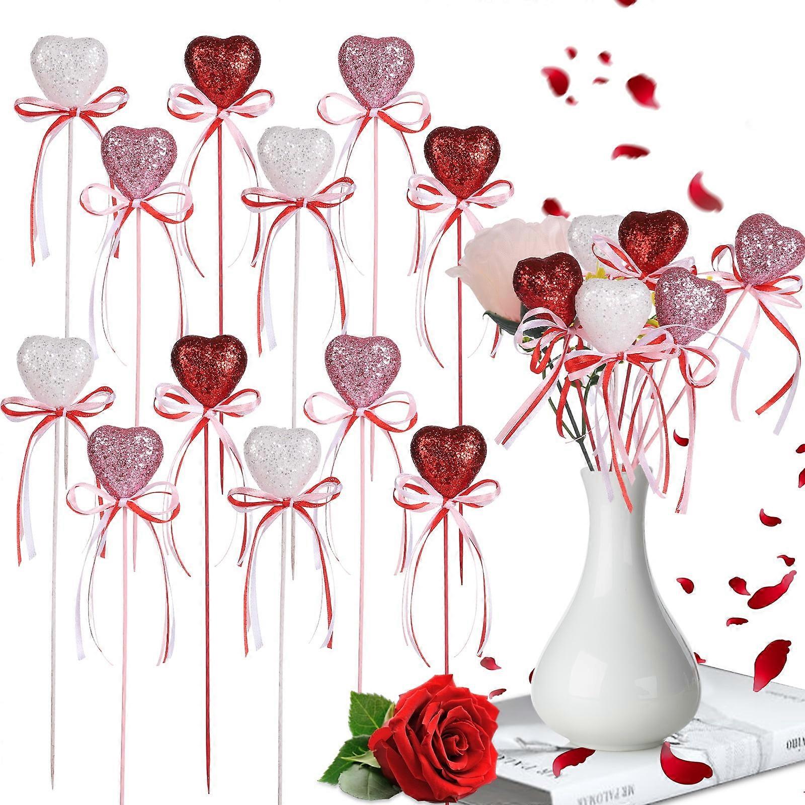 24 Pcs Valentine Glitter Foam Heart Picks, Sparkly Wooden Stems for Floral Arrangements, Home & Party Decor – Compatible with DIY Crafts