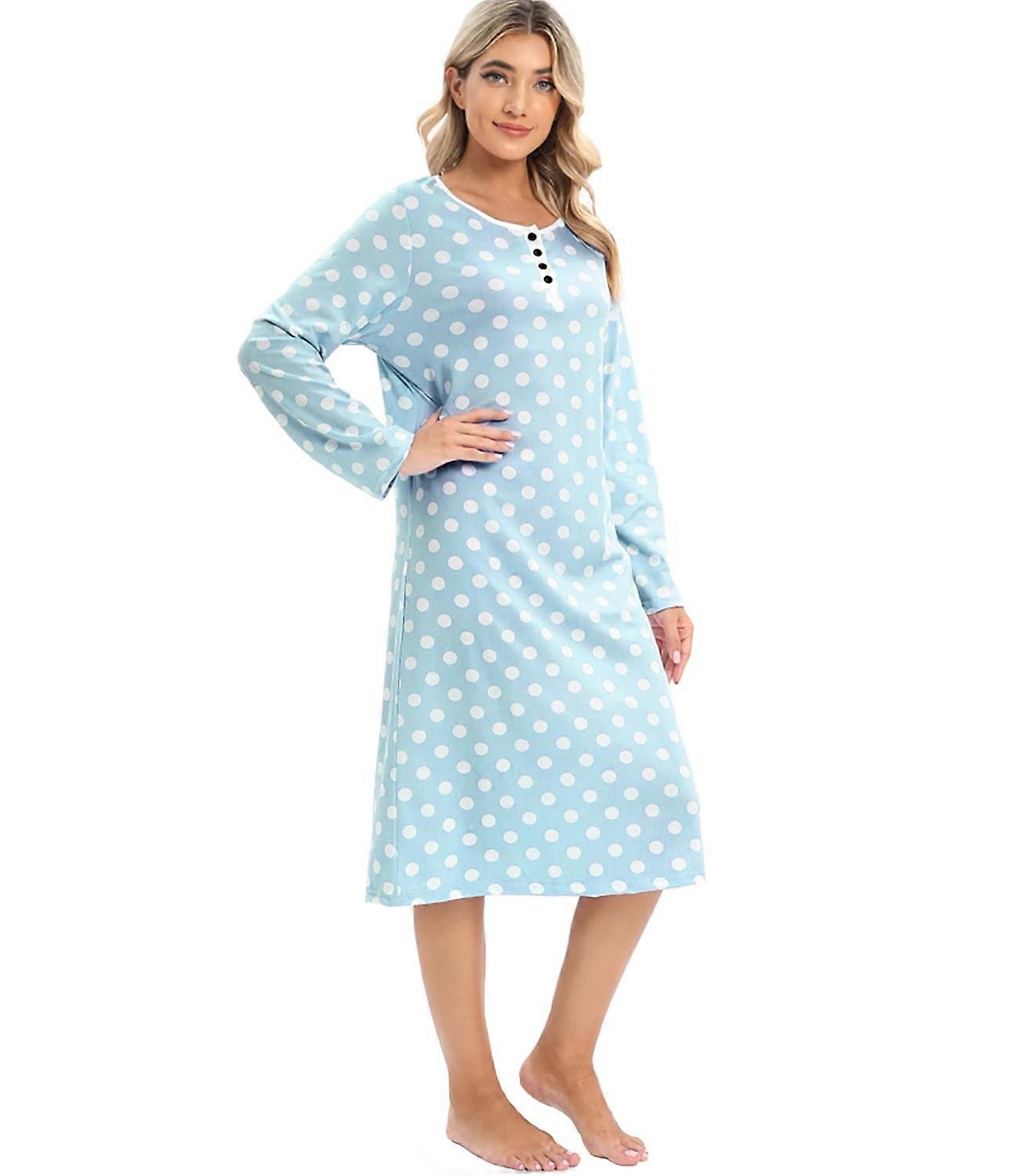 Womens Nightgown Long Sleeve Polka Dot Sleepshirts Spring Fall Loungewear House Dress Button Sleepwear Henley Nightdress, Sky Blue S