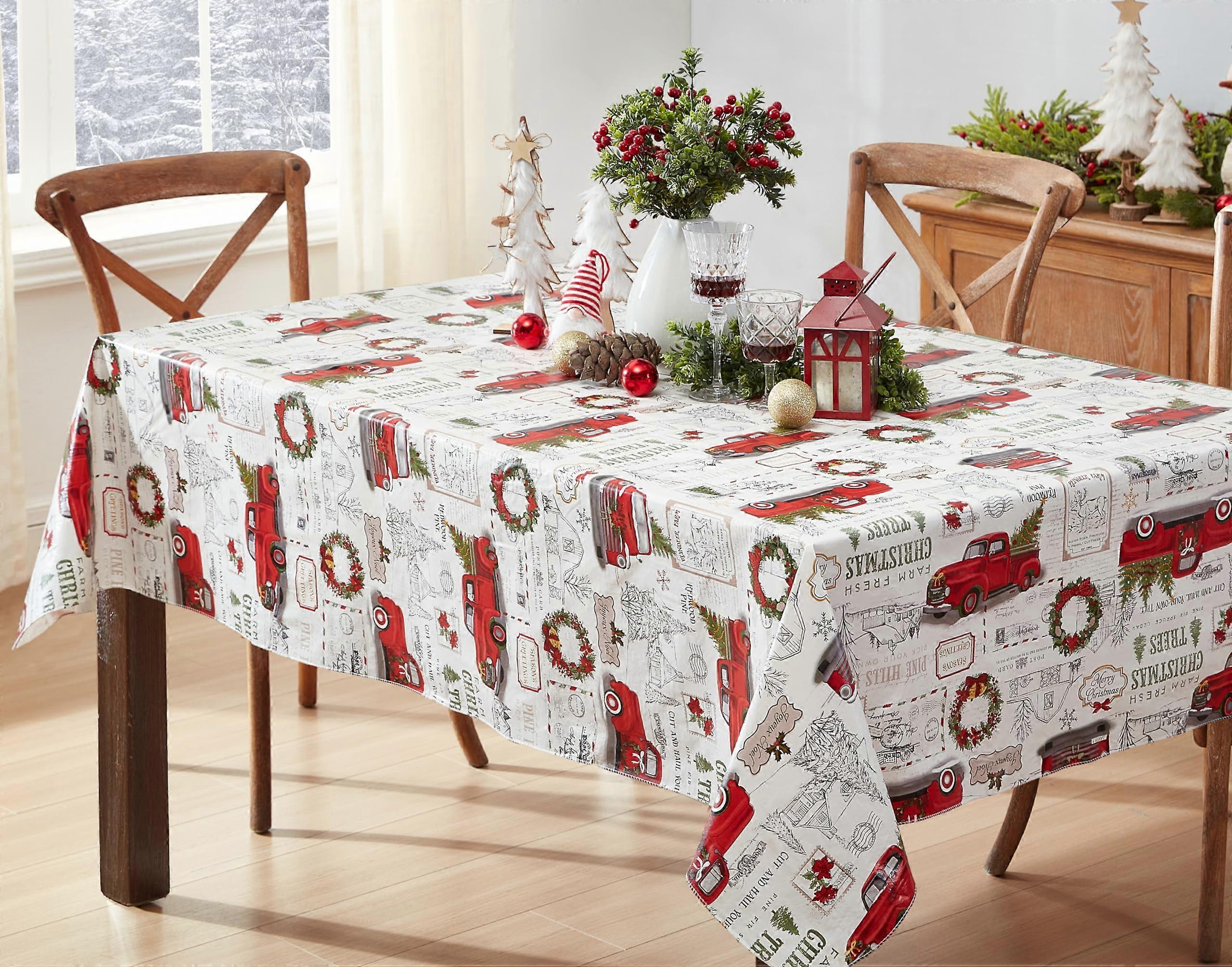 Holiday Christmas Tree Farm Truck Print 60 x 120 inch Rectangle Vinyl Flannel Backed Dining Tablecloth