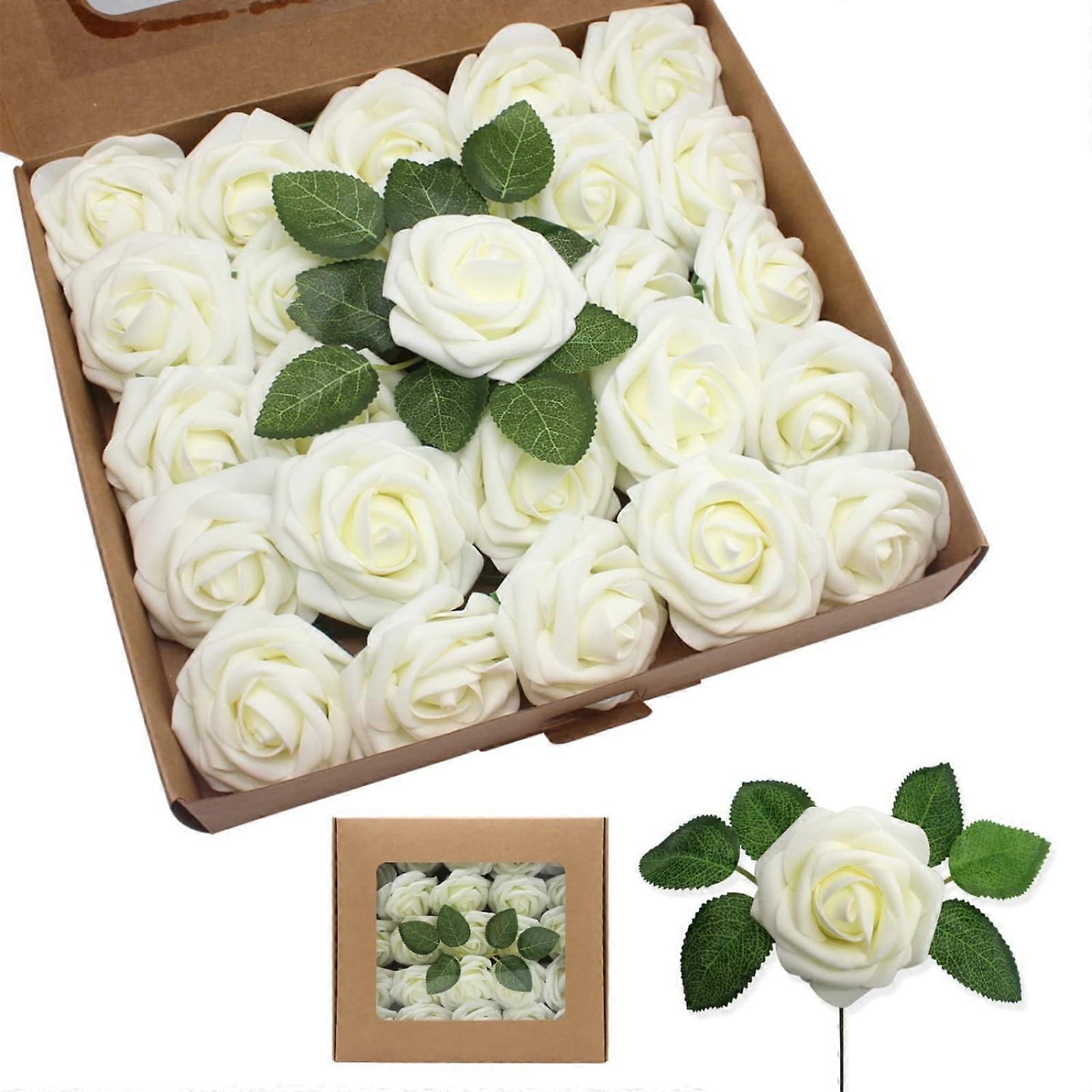 25pcs Realistic Ivory Foam Roses with Stems – DIY Wedding Bouquets, Baby Shower, Home Decor, Mother’s Day Gift – Compatible with Floral