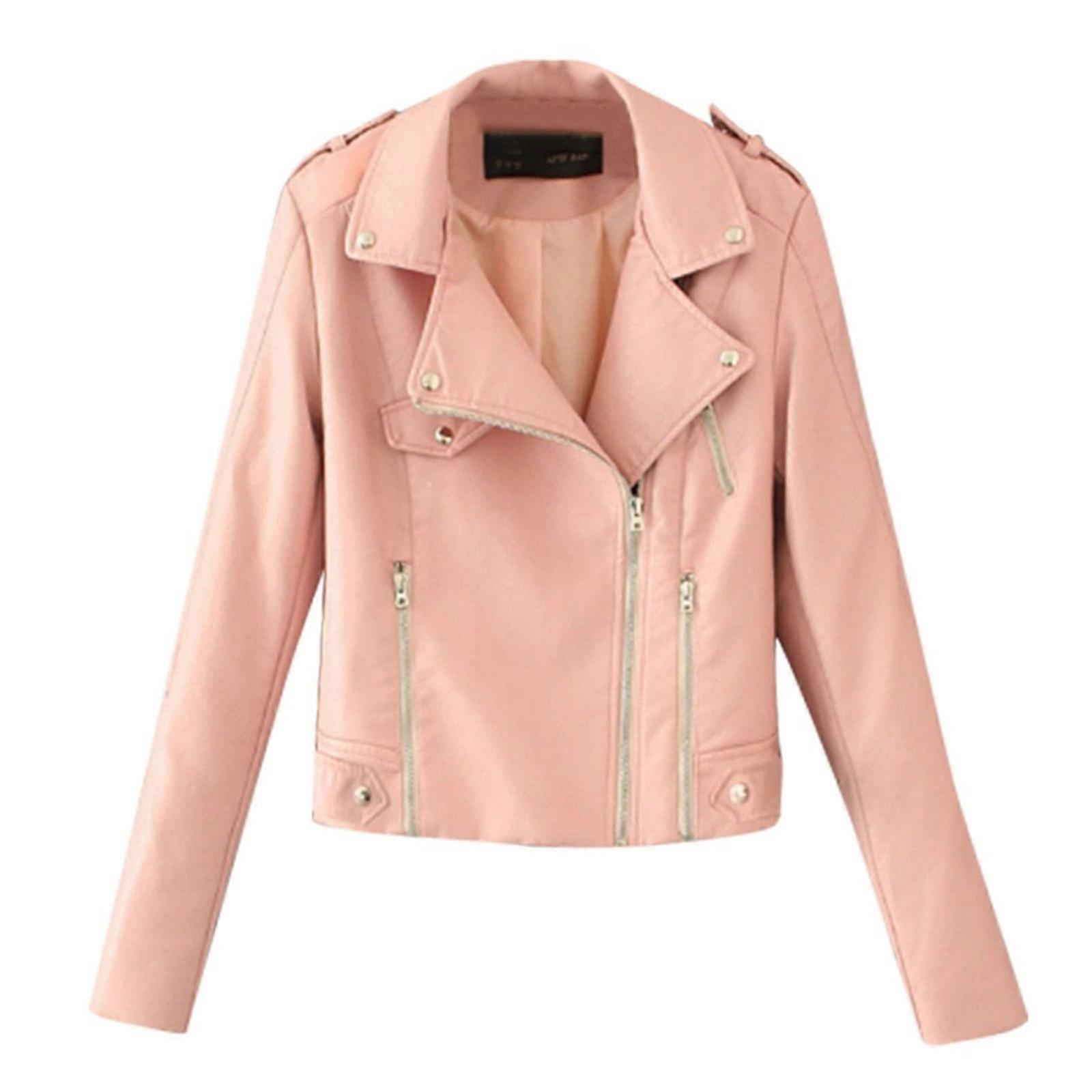 Womens Leather Jacket Casual Solid Color Lapel Zip up Cropped Tops Blouse Long Sleeve Motorcycle Jacket Coat Pink M