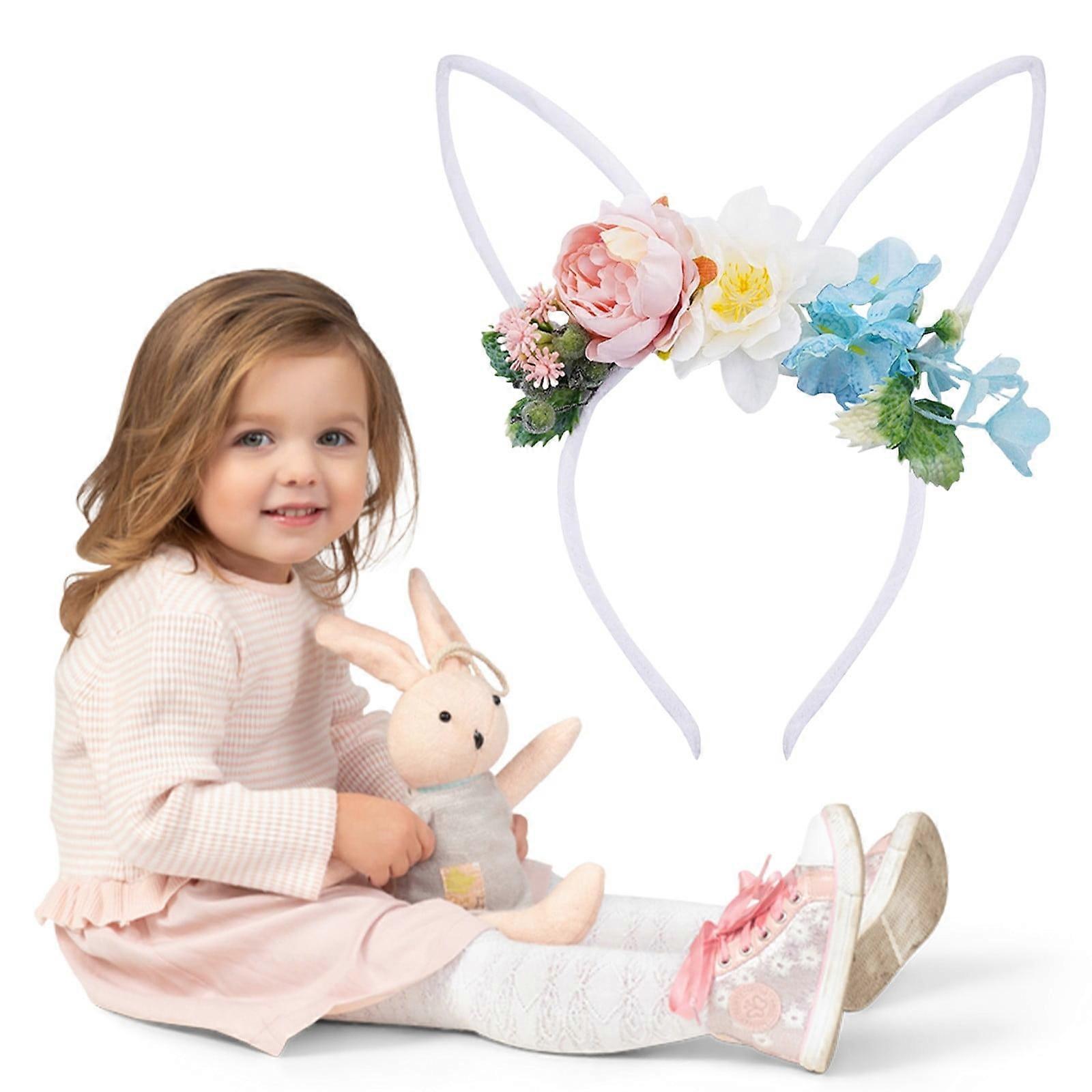Easter Bunny Ear Headband with Artificial Flowers Crown, Rabbit Long Ear Hairbands Festival Costume Hair Accessories for Girls Women