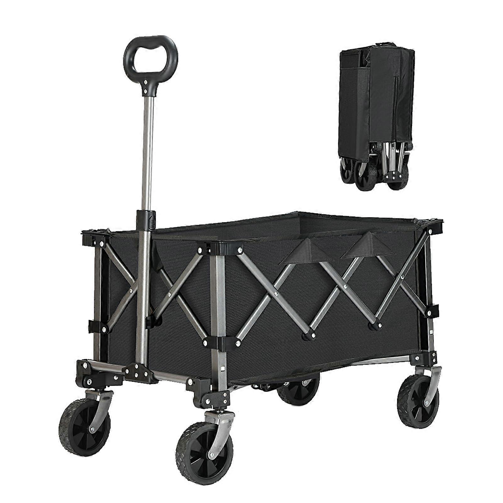 Collapsible Wagon Heavy Duty Folding Utility Garden Cart with Big AllTerrain Wheels Black Why you need this wagon Makes heavy or bulky loads easy to move. The sturdy folding design carries up to 220 pounds while saving you time and effort. Works on uneven ground. Large allterrain wheels roll smoothly across sand, gravel, grass, and pavement so you do not have to carry items by hand. Stores and transports with minimal fuss. The collapsible frame folds flat for compact storage in a trunk, garage, or closet. Key benefits and how it solves problems Heavy duty capacity: Supports up to 220 pounds so you can consolidate multiple trips into one, whether you are hauling sports gear, groceries, or camping supplies. Allterrain mobility: Big wheels reduce resistance and improve stability on beaches, trails, and lawns, reducing strain and protecting items from ground contact. Quick setup and collapse: Folding mechanism allows fast deployment and compact folding for transport and storage, eliminating the need for bulky carts or multiple bags. Versatile use: Designed as a utility cart for a wide range of tasks instead of a single specialty item, saving space and adding convenience. Important attributes Function: Collapsible folding wagon for transporting items easily between locations. Capacity: 220 pounds maximum load. Mobility: Equipped with large allterrain wheels for varied surfaces. Color: Black for a lowprofile, easytokeepclean appearance. Portability: Folds compactly for vehicle trunks and home storage. Construction: Built for durability and repeated folding and unfolding during regular use. Practical use scenarios Beach trips: Load coolers, towels, umbrellas, and chairs and pull them across sand without multiple trips. Camping and picnics: Move tents, stoves, food, and firewood from car to campsite in one trip and collapse the wagon for storage at the site or in your vehicle. Sports and events: Carry folding chairs, equipment, and bags to practices, tournaments, or outdoor events and fold away when not in use. What makes it stand out Balances strength and portability with a load capacity and a foldflat design. Large wheels designed for nonpaved surfaces improve usability in outdoor settings where standard smallwheeled carts struggle. Neutral black finish and practical layout match a variety of uses from shopping to outdoor recreation. What to expect in everyday use Easy to pull or push over common outdoor surfaces. Quick transition between folded and open states to save time. Practical capacity for family outings, errands, and small work tasks. Specifications at a glance Product type: Collapsible folding utility wagon Load capacity: 220 pounds Wheels: Big allterrain wheels Recommended uses: Beach, camping, sports, shopping, gardening Color: Black Choose this collapsible wagon when you want a practical, portable solution for moving moderate loads across a variety of outdoor surfaces without the hassle of multiple trips or bulky storage.