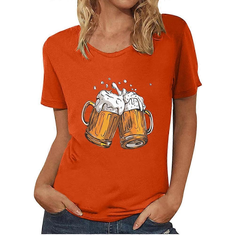 QLEICOM Oktoberfest T-Shirts for Women – Casual Crewneck Loose Tops with Beer Mug Print, Vintage Funny Pattern, Drop Sleeves, Orange A/XL