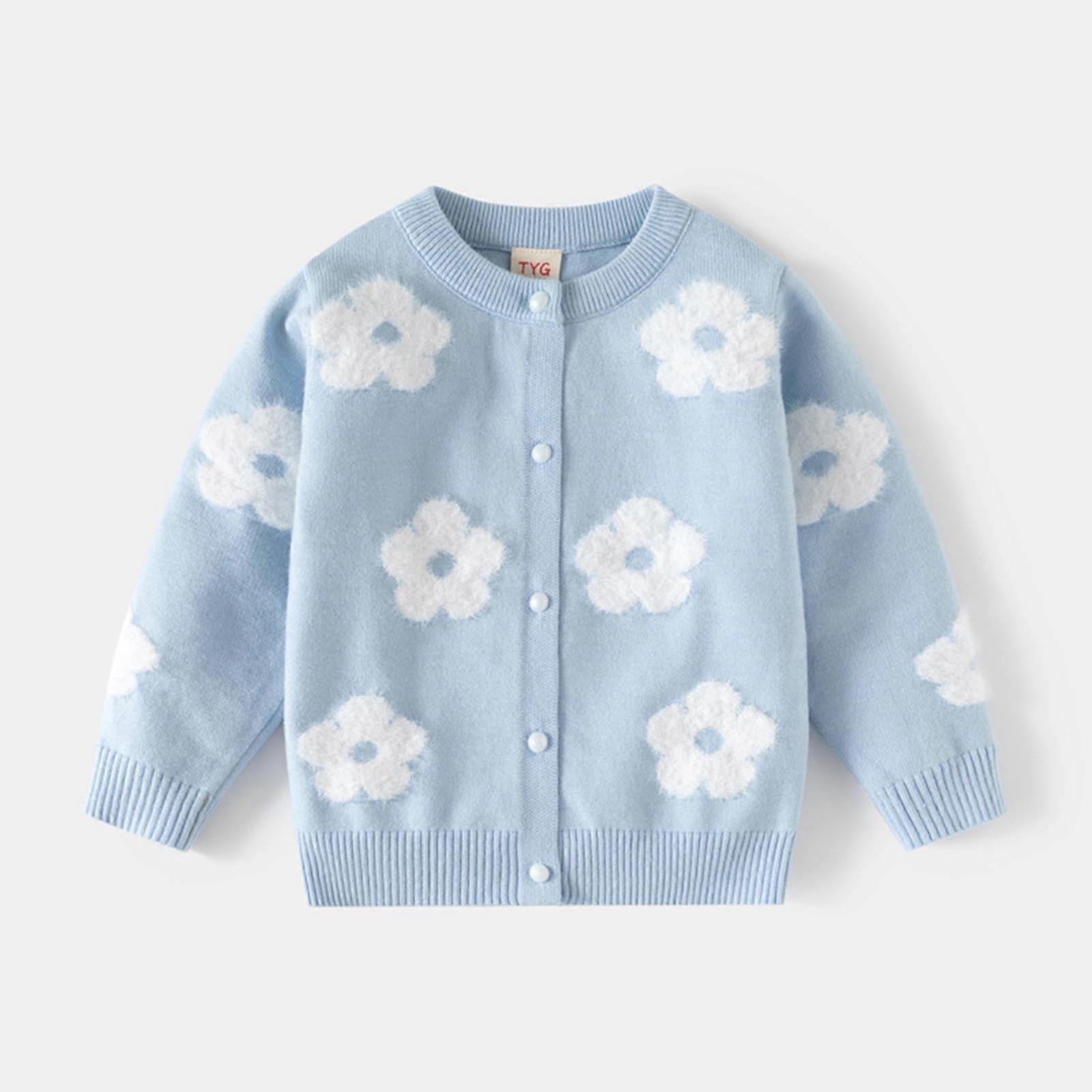 Girls' Flower Print Knit Cardigan, Long Sleeve Crewneck Sweater for Toddlers & Kids, Fall/Winter Blue, 7-8 Years, Compatible with Kids' Wardrobe