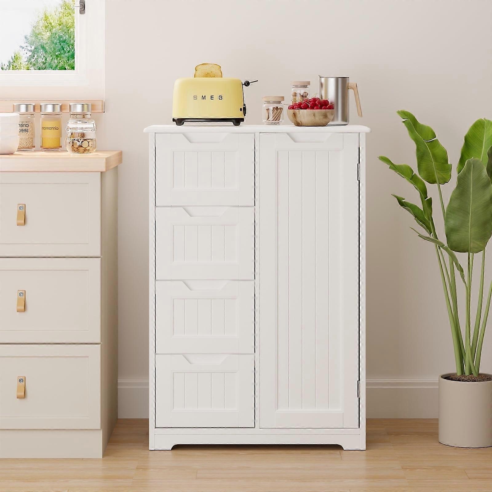 33" White Moisture-Resistant Anti-Tip Pantry Cabinet with Door, 4 Drawers & Shelves
