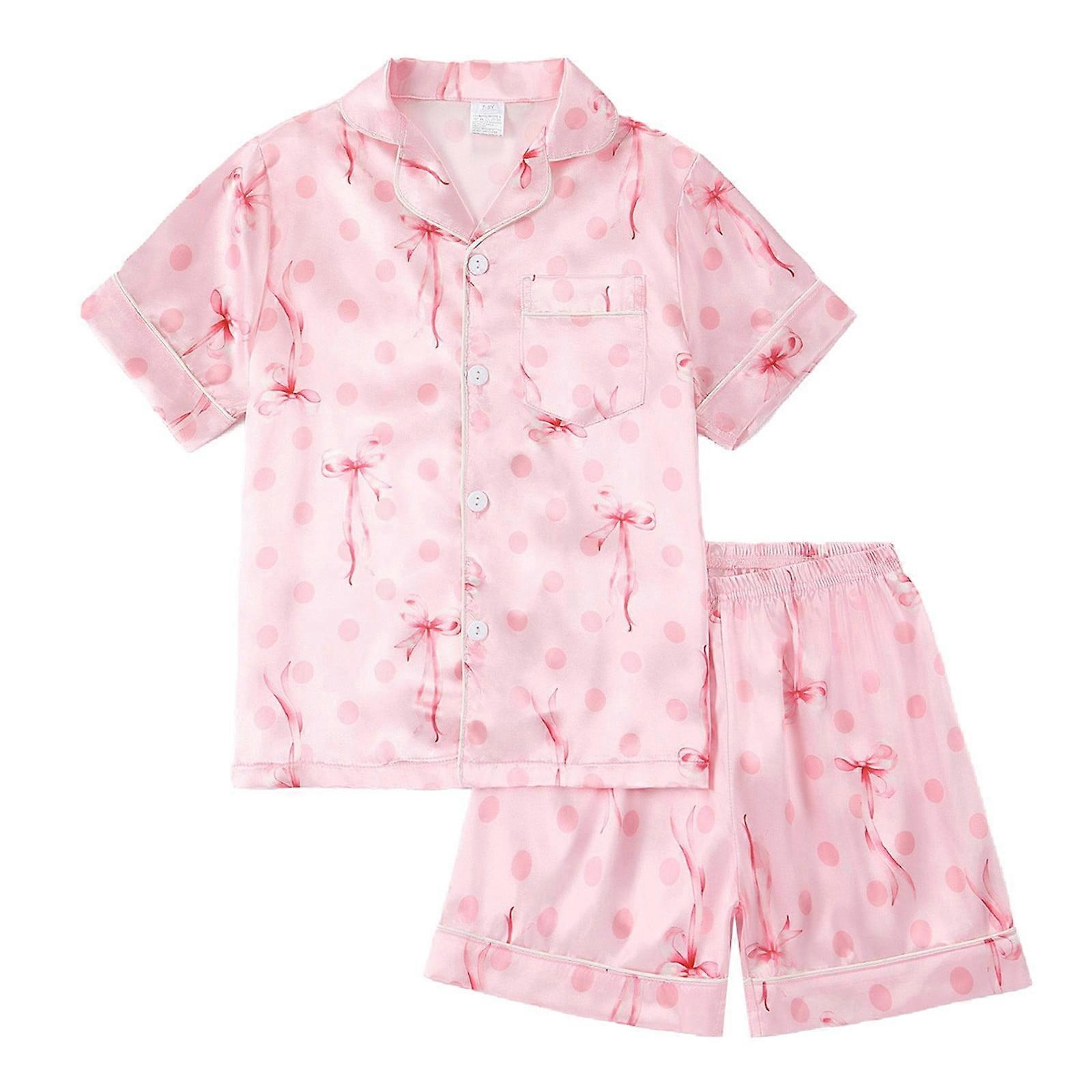 Ediodpoh Kids Pajamas for Girls 4-14Y, Satin Short Sleeve Button-Front Top & Comfortable Shorts, Pink, Soft Silk-Like Sleepwear