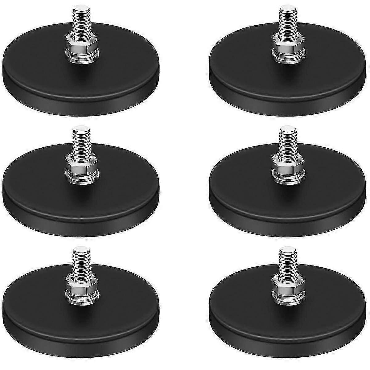 You will receive of 6 threaded magnets with black rubber coating, including threaded magnets with bolts, M6 spring washers, M6 flat washers and M6 nutsThe neodymium magnet base is rubber coated to protect the magnet from damage, avoid scratching painted surfaces and restrict the magnet from sliding on slippery surfaces.POWERFUL MAGNET MOUNTING BASE: The rubber-coated round base is 1.69 inches/43mm in diameter and houses 6 neodymium magnets with 22 pounds of vertical magnetic pull against the steel base.Convenient for outdoor use: Our vertical neodymium disk magnets have 3 layers of corrosion-resistant coating on the surface to protect accessories, and the outer rubber coating is also waterproof, so it can be used outdoors for a long time with confidence.Multifunctional use: M6 external thread studs, screw directly into the threaded holes of the fixed body or pass through the holes and tighten with washers to connect any hardware components. Perfect for cameras, light bars, display panels, automation equipment, tools and machines.Quantity:6PCSColour:BlackMaterial:Metal+RubberSize:Diameter:43mmPackage Contents:6 * threaded magnets with M6 Threaded Magnet with Bolts and NutsOnly the above package content, other products are not included.Note: Light reflection and different displays may cause the color of the item in the picture a little different from the real thing. The measurement allowed error is +/- 1-3cm.