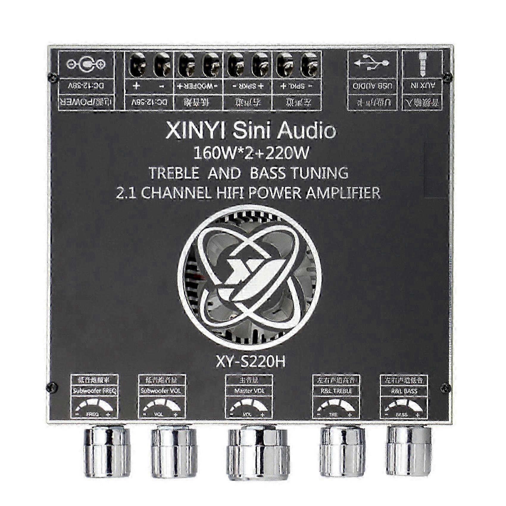 Product model: XY-S220H Power supply: above DC12-38V/10A Bluetooth-compatible version: 5.1 Audio channel: 2.1 channels Audio input: Bluetooth-compatible + AUX + USB flash disk + USB sound card Audio output: left and right channels + subwoofer Frequency range: 20Hz -- 20KHz Volume adjustment: high-end encoder knob adjustment, smooth feel Maximum output power of left and right channels: 180W/3 ohm--36VDC 80W/8 ohm--36VDC Maximum output power of subwoofer: 220W/3 ohm--36VDC 160W/4 ohm-36VDC Protection mechanism: overvoltage, undervoltage, clipping, short circuit, overheating and other protection Unique functions: support sinlink app, modify Bluetooth-compatible name, set Bluetooth-compatible password, and turn off / on prompt tone Colour: black Material: plastic Size: about 134x126x26mm Package Contents: 1 * Bluetooth power amplifier board module Only the above package content, other products are not included. Note: Light and different displays may cause the color of the item in the picture a little different from the real thing. The measurement allowed error is +/- 1-3cm.