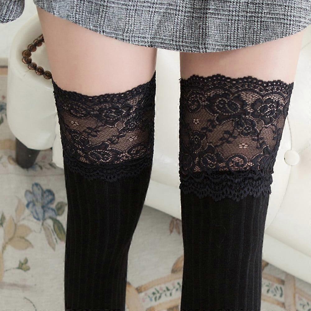 Nylons Women Lace Trim Thigh High Over The Knee Socks Long Cotton Warm Stockings Knee High Socks For Women (Black,One Size)