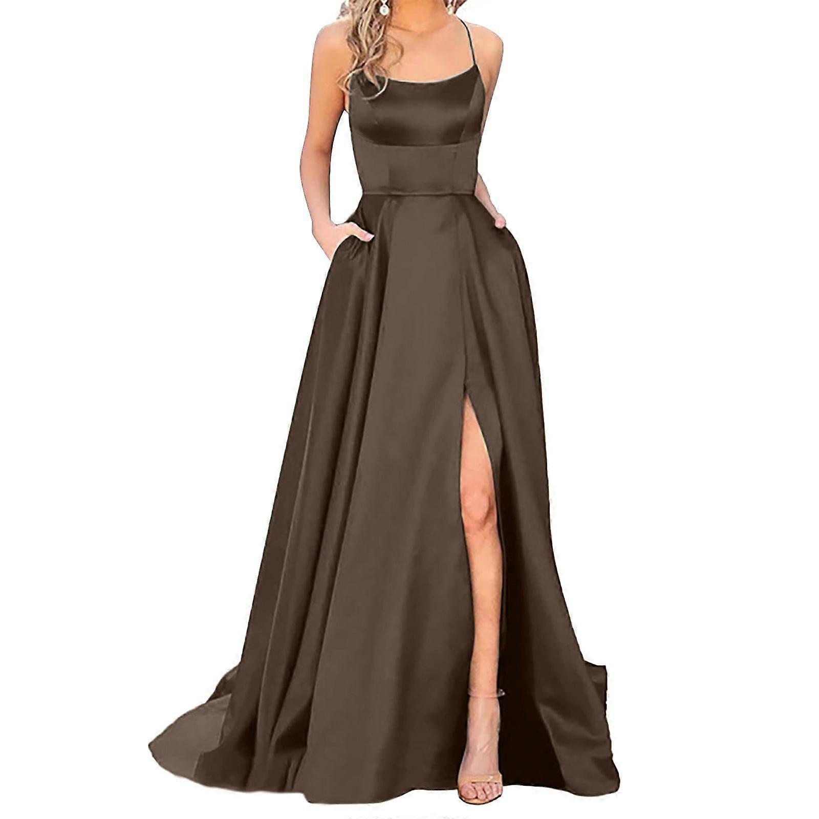 Sexy Chocolate Brown Bridesmaid Dress – Long Elegant Halter Backless Satin Prom Dress with Side Slit & Pockets