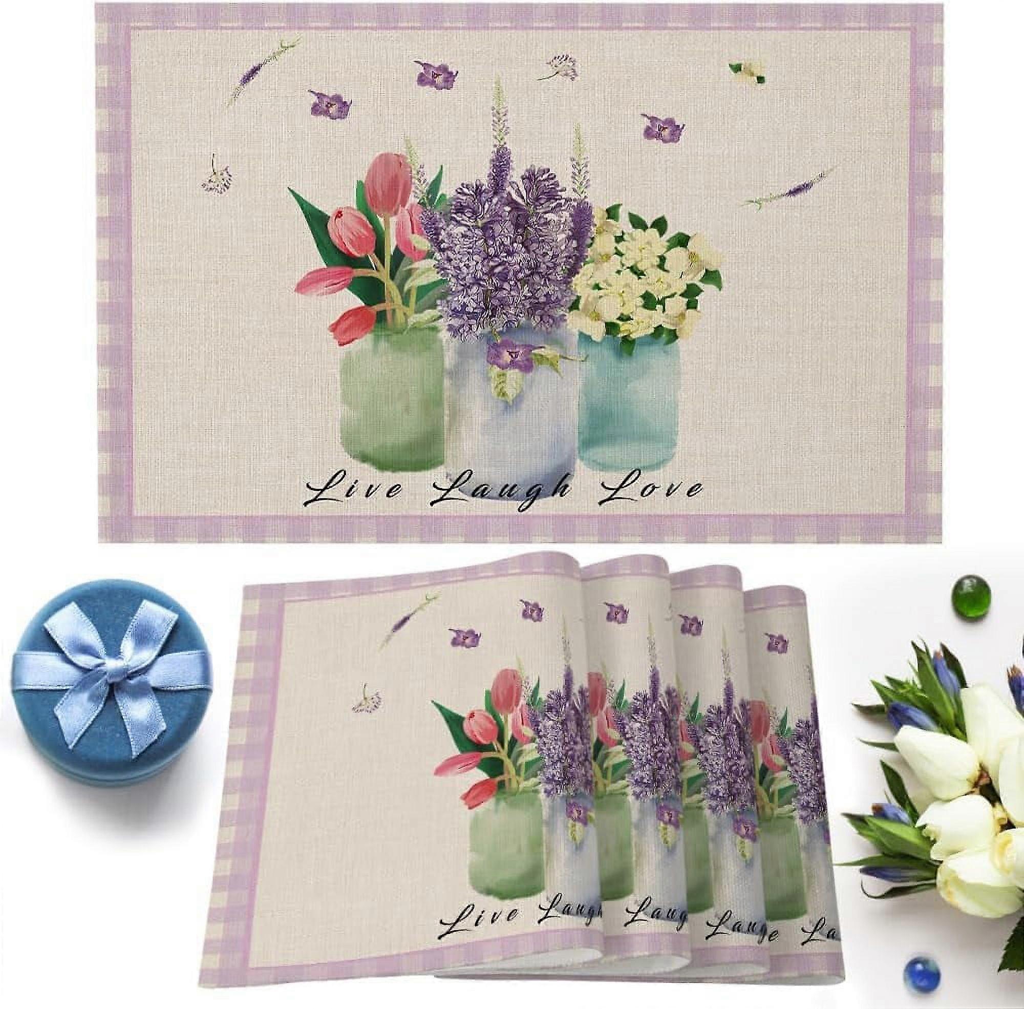 Buffalo Plaid Lavender Vase Placemats Set of 6, Spring Floral, Non-Slip & Wipe-Clean Linen, Heat-Resistant Table Mats for Indoor/Outdoor