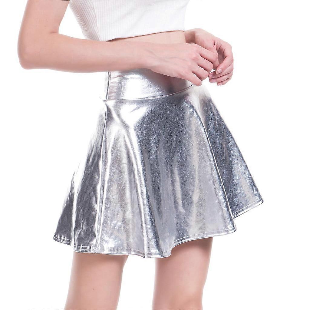 YOUSNH Women's Casual Fashion Shiny Metallic Flared Pleated A-Line Mini Skirt Womens Skirt White S