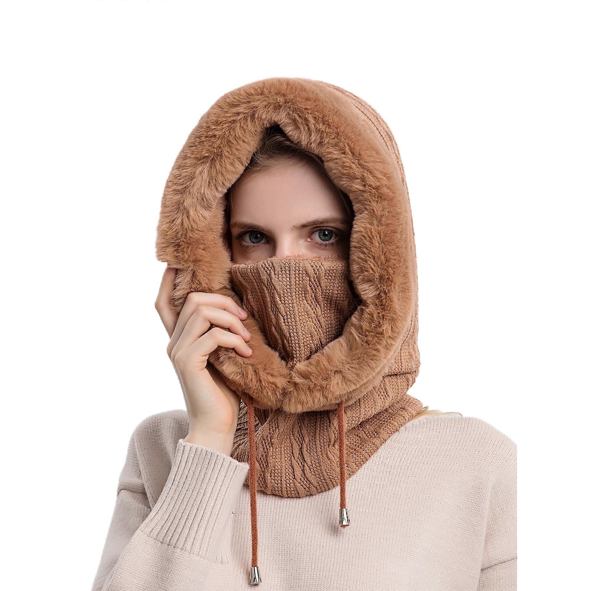 Women 3 in 1 Slouchy Fleece Beanie Hats Scarf Mask Hooded Balaclava Hat Winter Warm Windproof Ski Skull Cap for Outdoor Sport, Khaki