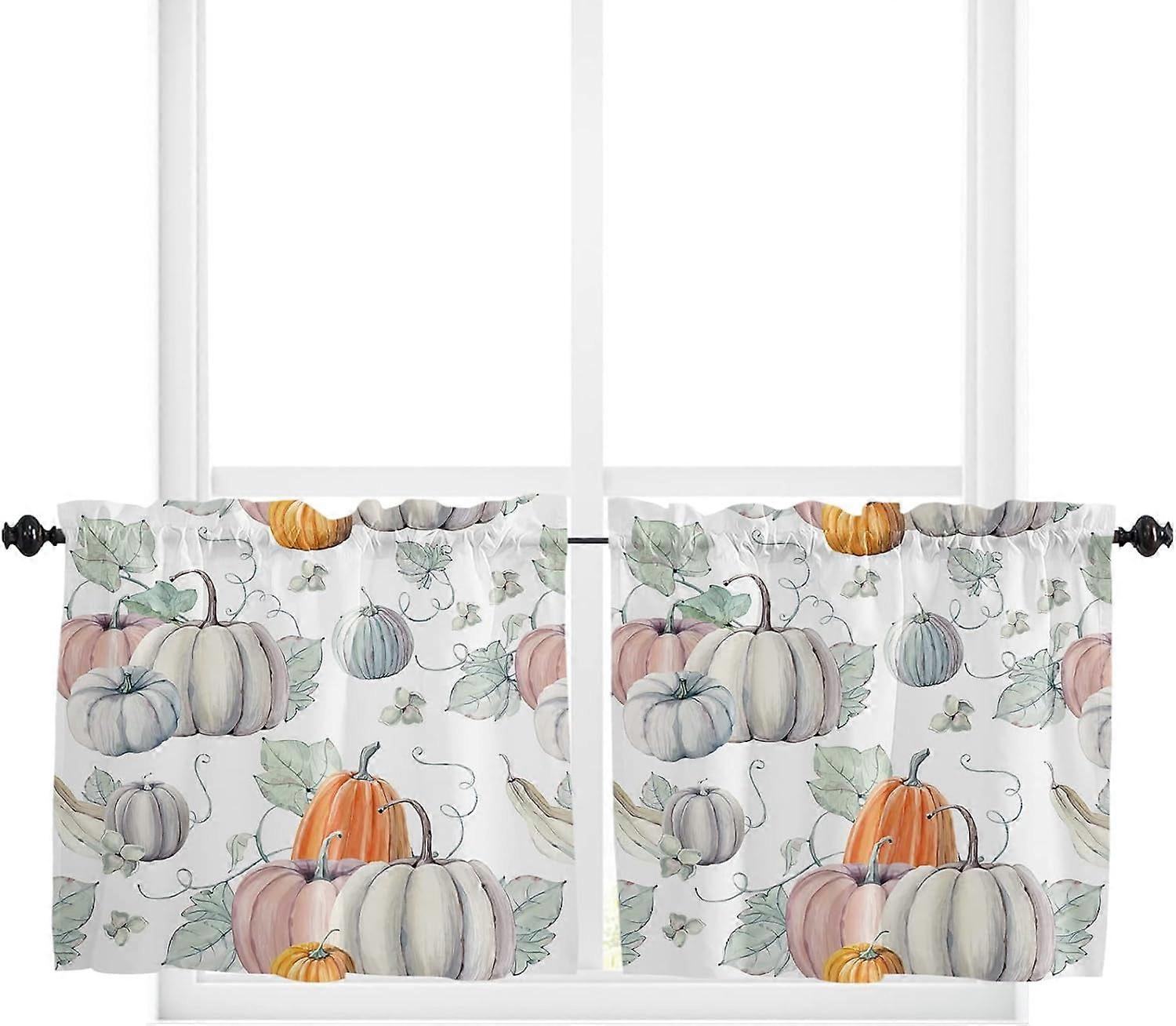 Thanksgiving Fall Kitchen Curtains, Autumn Pumpkin Pattern Watercolor Rod Pocket Valance Short Window Treatment Decor Curtains, 27.5" x 36", 2 Panels