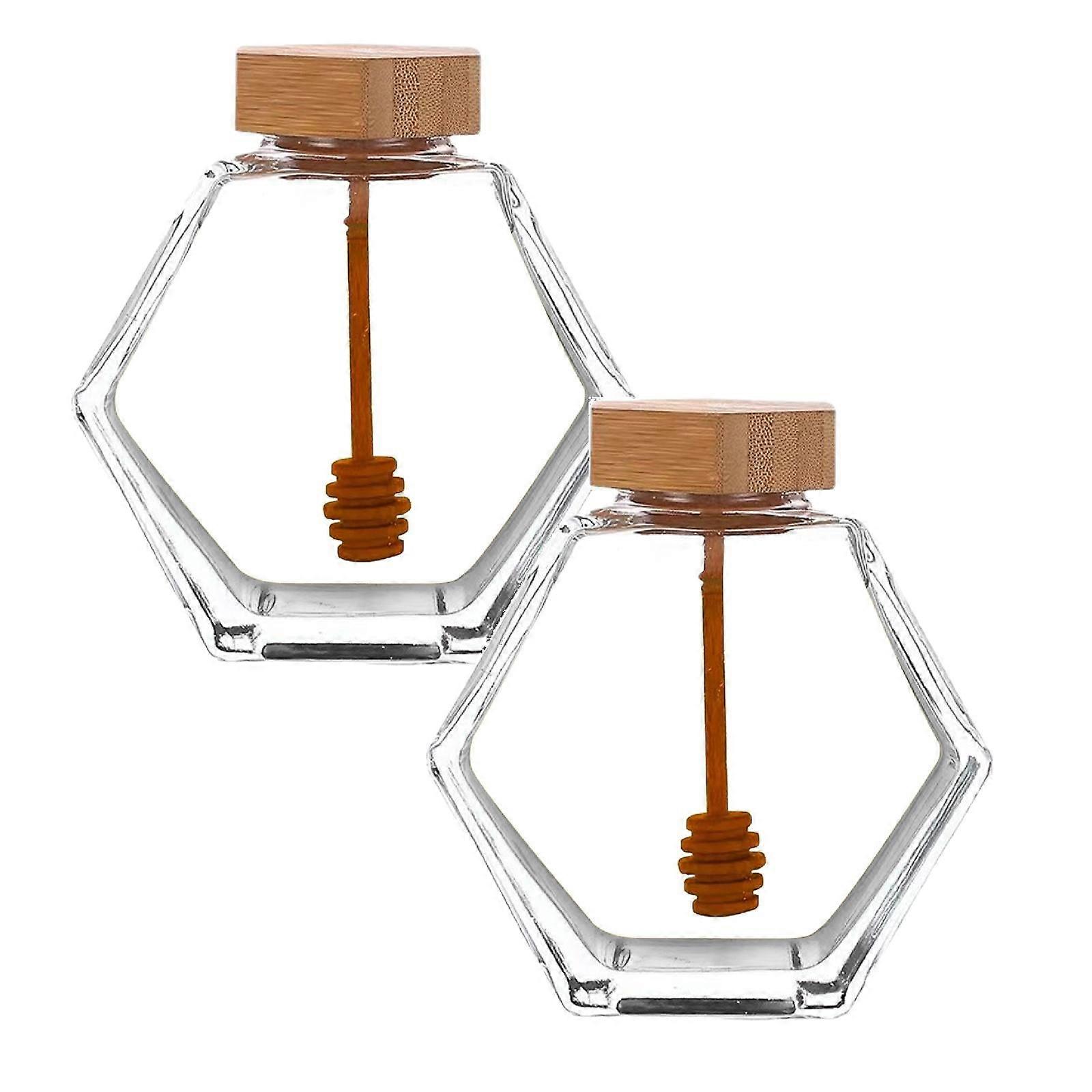 2 Pack 13 oz Hexagon Glass Honey Pots with Wooden Dipper & Cork Lid, Heat-Resistant, Clear