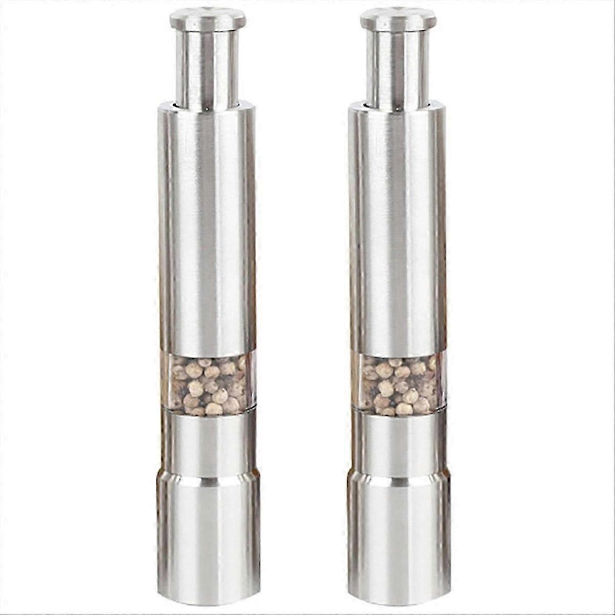 Experience the ease of seasoning with our innovative stainless steel grinders. Just press the top to release the perfect amount of spices. Ideal for pepper, sea salt, and Himalayan salt, these grinders bring convenience and functionality to your fingertips.Designed for one-handed operation, these salt and pepper grinders make cooking simple. Each grinder features a user-friendly push button and an easy refill system from the bottom, ensuring a seamless cooking and dining experience without the hassle of traditional grinders.Not just for salt and pepper! Our versatile grinders are perfect for grinding a variety of small spices such as mustard seeds and corn. Enhance your cooking and dining with freshly ground spices, adding depth and flavor to every meal.Elevate your culinary creations with the perfect kitchen tool for fresh pepper and other spices. Ideal for preparing gourmet meals or flavoring your steaks, our grinders offer restaurant-quality results right in your own kitchen.A terrific addition to any kitchen or dining setting, our grinders are capable of handling a variety of foods including chili peppers. They are equally suited for use in home kitchens as well as environments like restaurants and hotels.Specifications: Bottom diameter 27 x height 153mmPurpose: Grinding pepperCapacity: About 20 gramsRecommendation: Small and portable, does not take up space, a must-have at home or on the go!Colour:SilverMaterial:Stainless SteelPackage Contents:2x Manual Salt And Pepper GrinderOnly the above package content, other products are not included.Note: Light reflection and different displays may cause the color of the item in the picture a little different from the real thing. The measurement allowed error is +/- 1-3cm.