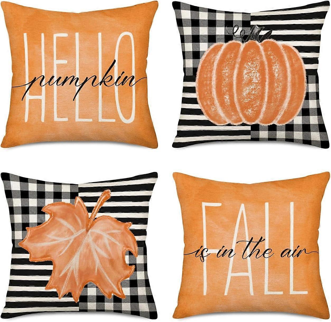 Fall Decor Pillow Covers 18x18", Set of 4: Hello Pumpkin, Maple Leaves, Buffalo Plaid, Harvest & Thanksgiving Farmhouse Style