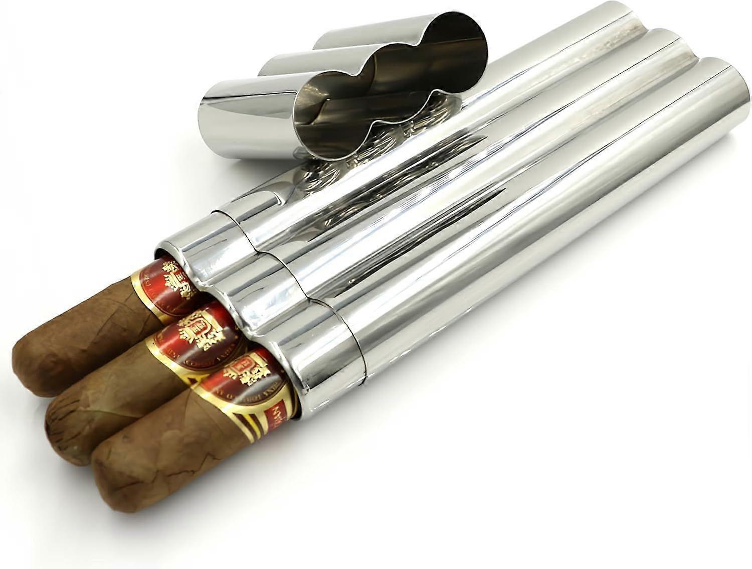 Name: 3-Finger Cigar Tube Material: stainless steel Capacity: Can hold three cigars with a ring gauge of 50 (0.78inches/19.8mm) Size: 8.27*2.52*0.95inches (210*64*24mm)