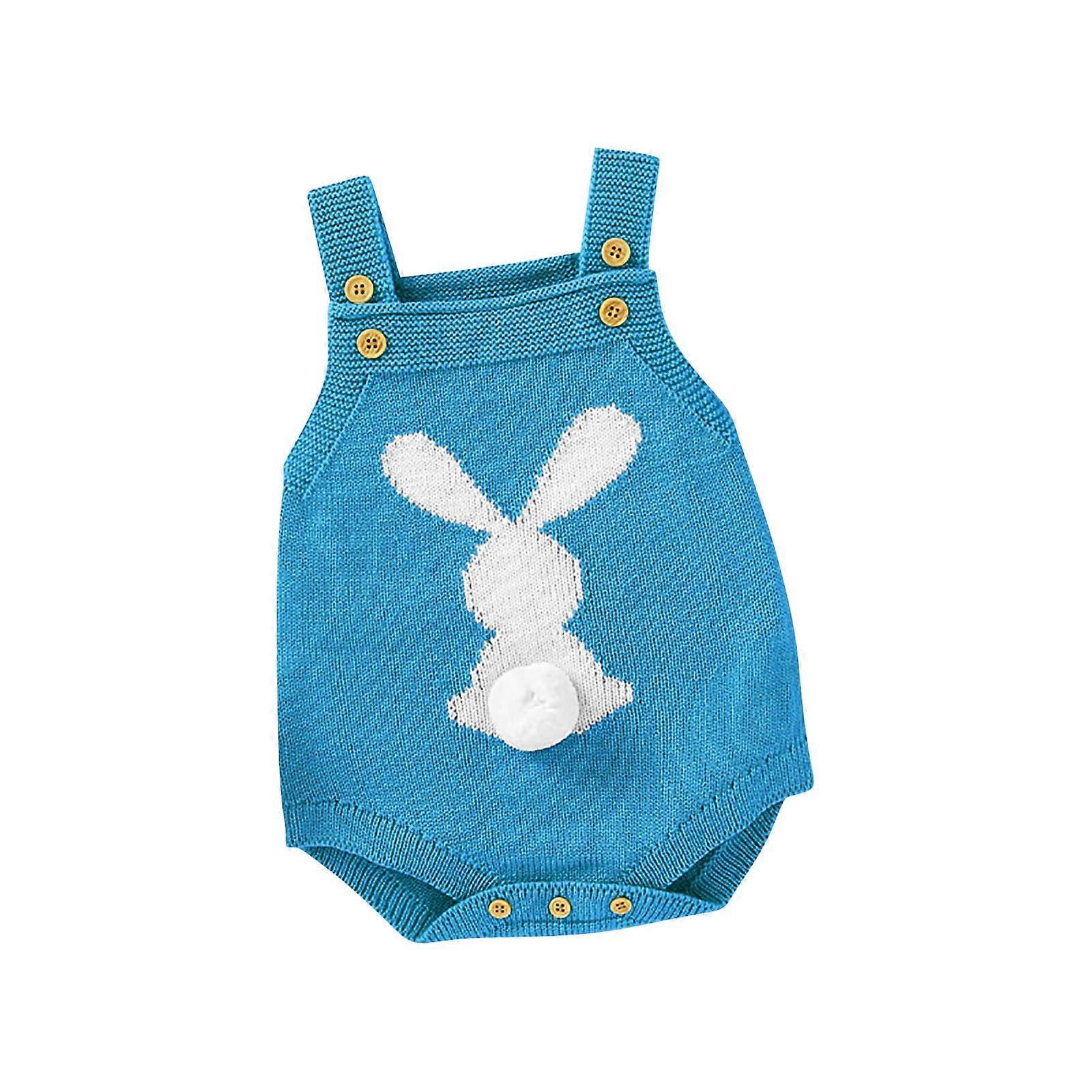 Gender Neutral Baby Romper with 3D Bunny Tail, Knitted Suspenders, Easter Wear – Sky Blue, Size 73