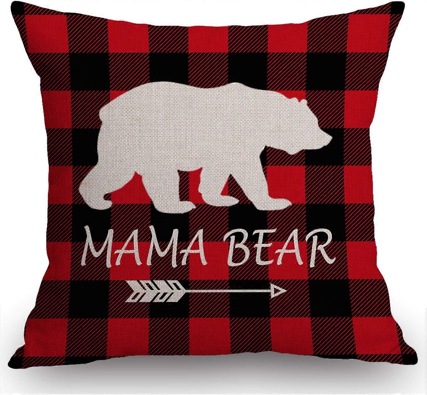 Mama Bear Buffalo Plaid Throw Pillow Case, 18x18", Cotton Linen Cushion Cover for Sofa, Armchair, Bedroom – Compatible with Standard Pillows