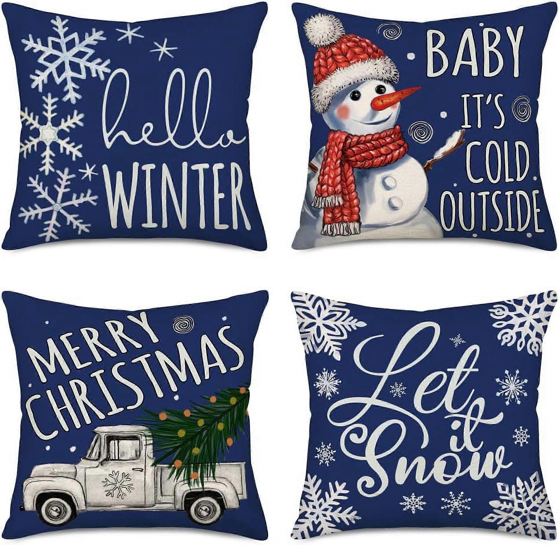 Winter Christmas Pillow Covers 16x16", Silver Truck & Snowflake Design, Blue Farm Xmas Tree, Snowman, "It's Cold Outside", "Let It Snow", Set of 4 –