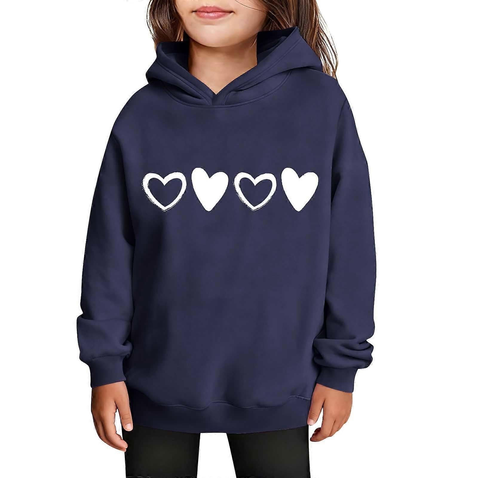 Girls Valentine's Hooded Sweatshirt Long Sleeve Casual with Heart Print Kids Spring Fall Fleece-Lined Solid Color Everyday Top(Navy#1,3 Years)