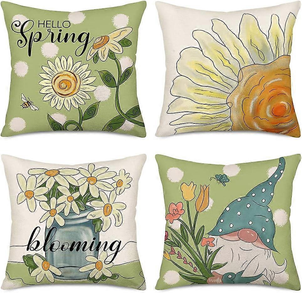 Hello Spring Pillow Covers 20x20", Set of 4, Blooming Flowers & Polka Dot Farmhouse Decor, Sunflower & Gnome Design, Compatible with Standard