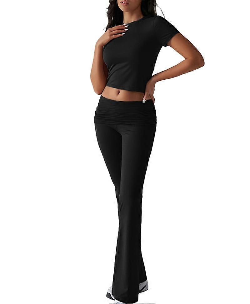 Women'S 2 Piece Outfits Lounge Sets Ruched Short Sleeve Tops High Waisted Wide Leg Pants Tracksuit Sets Black XL
