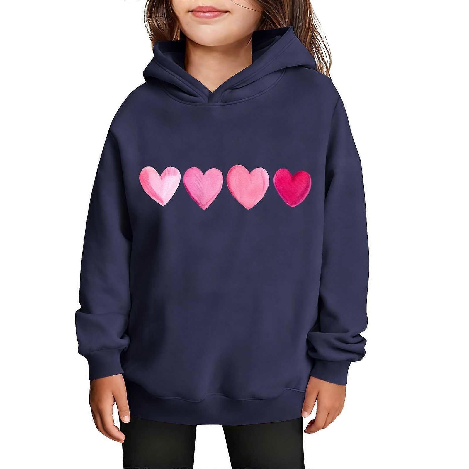 Girls Valentine's Hooded Sweatshirt Long Sleeve Casual with Heart Print Kids Spring Fall Fleece-Lined Solid Color Everyday Top(Navy,4 Years)