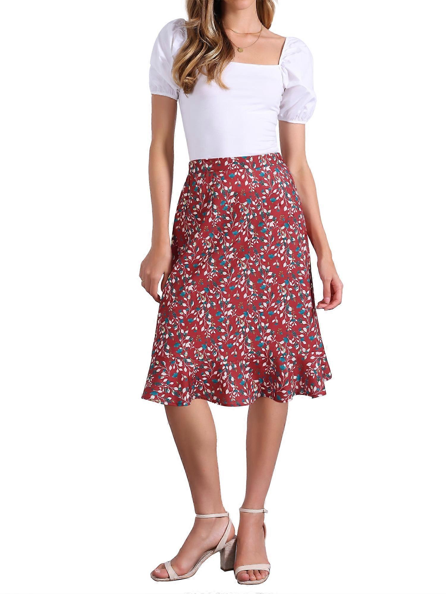 Women's Floral High Waist Flowy A-Line Split Ruffle Knee Length Skirts XS Dark Red