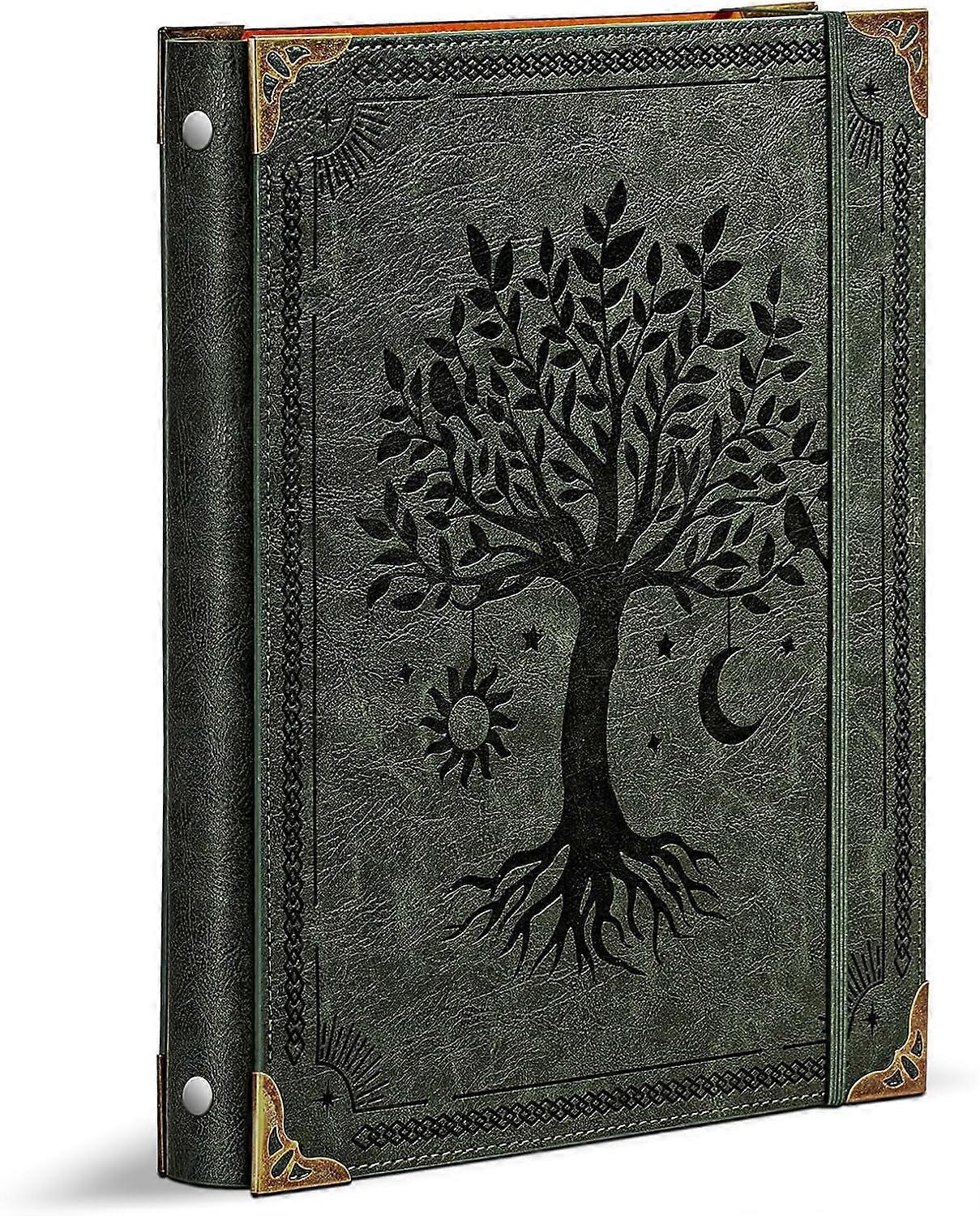 Leather 3 Ring Binder Fits 8.5"x11" Letter Size Paper, 1 Inch Round Holds 200 Sheets, Notebook Cover Loose Leaf Organizer, Green Tree