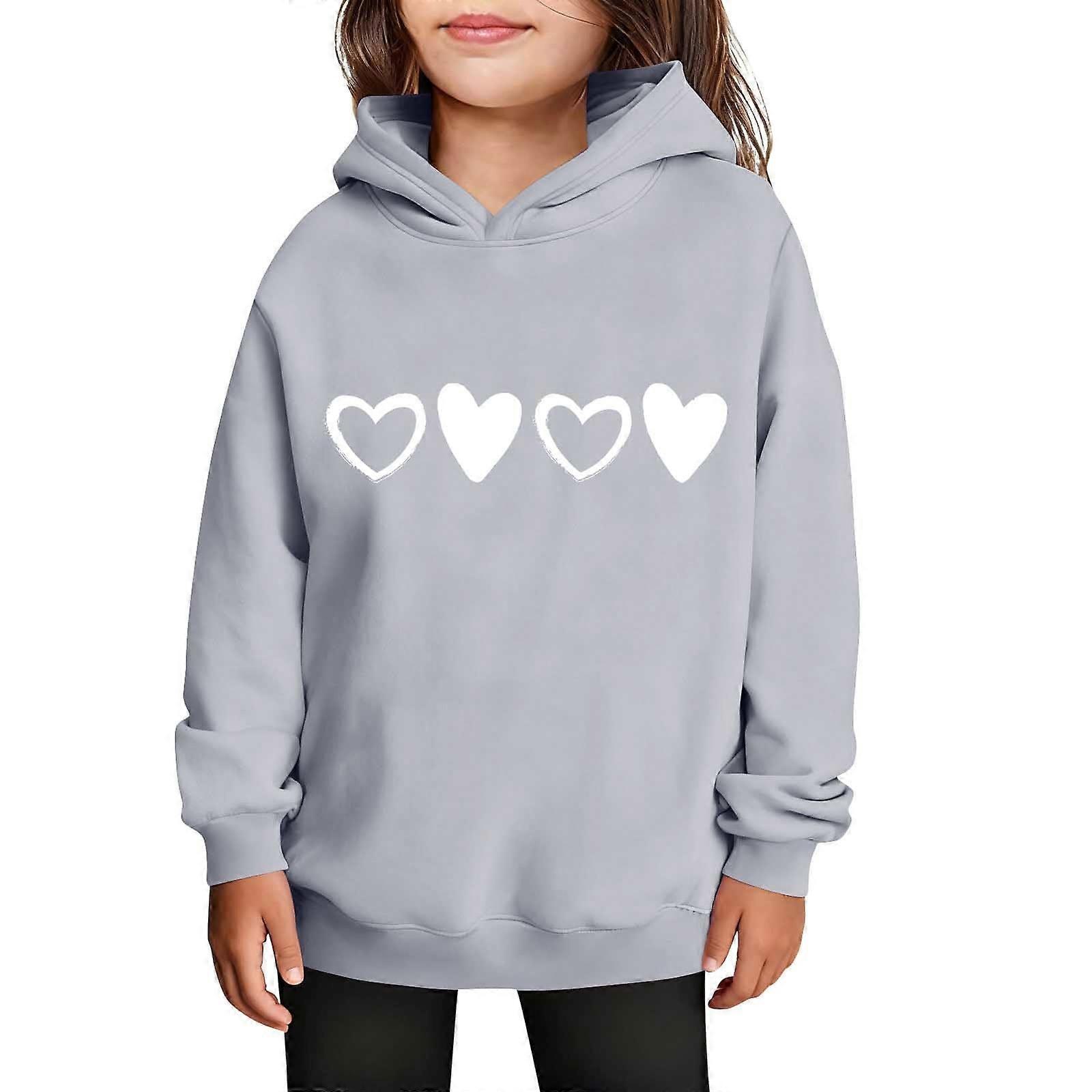 Girls Valentine's Hooded Sweatshirt Long Sleeve Casual with Heart Print Kids Spring Fall Fleece-Lined Solid Color Everyday Top(Gray#1,4 Years)