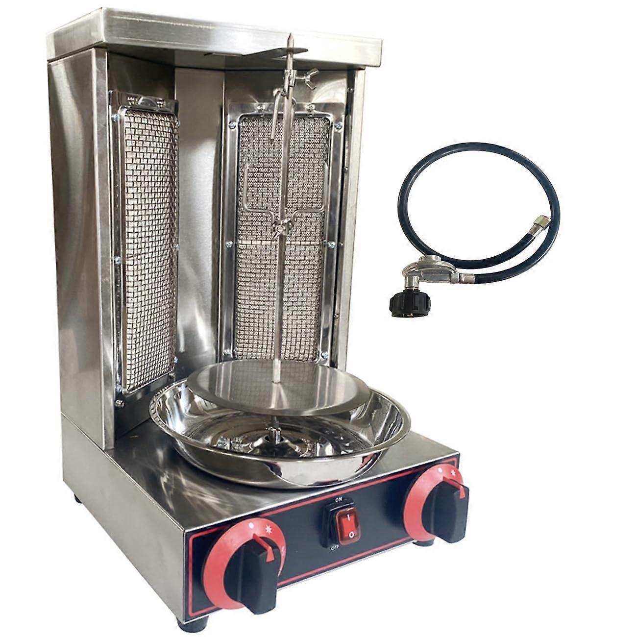 LPG Vertical Shawarma Doner Kebab Gas Broiler with 2 Burners Key benefits Consistent, continuous cooking: Vertical broiling concentrates heat around a stacked meat cone for even browning and straightforward carving during service. Faster service throughput: Twoburner design provides more cooking surface and faster heat recovery, helping maintain steady output during peak periods. Space efficient footprint: Vertical layout uses counter space effectively, making it suitable where floor space is limited. Simple fuel compatibility: Designed to run on LPG gas for quick startup and reliable heat. How this machine solves common kitchen problems Reduces bottlenecks during busy shifts by delivering steady, volume roasted meat ready for slicing. Helps produce consistent product appearance and texture batch after batch through focused, closerange heating. Simplifies operation and service flow so staff can maintain continuous supply without complex setup. Main functions and practical features Vertical gas broiler for shawarma, doner, kebab, gyro and similar roasted meat preparations. Twoburner configuration to provide concentrated heat across the meat cone for uniform cooking. Controls that allow operators to manage cook intensity and maintain the desired browning. Design suited for countertop installation in commercial kitchens and food service environments. Compatibility and suitability Fuel: LPG gas operation. Use cases: Restaurants, takeout shops, food trucks, street vendors, catering operations and concession stands where vertical roasting is required. Use scenarios Quick service restaurant: Operate during lunch rush to produce continuous slices of doner or gyro meat for sandwiches and plates with predictable timing. Food truck or street vendor: Install on a compact counter to offer shawarma and kebab items while conserving valuable space. Catering or event prep: Prepare large volumes of roasted meat onsite for carving to , improving freshness and presentation. Practical notes Intended for commercial foodservice use where vertical broiling of layered meat is required. Operates on LPG gas; plan for proper gas supply and professional installation to meet local codes. This vertical gas broiler with two burners provides a focused, spaceefficient solution for volume shawarma, doner and kebab preparation, helping kitchens deliver consistent roasted meat with efficient throughput.