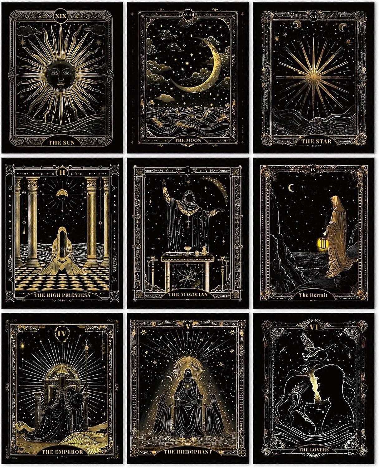 Tarot Wall Art Prints Set of 9 Gold Black Tarot Theme Poster Wall Decor Home Artworks for Gallery Living Dining Room Bedroom Bathroom Multi-color