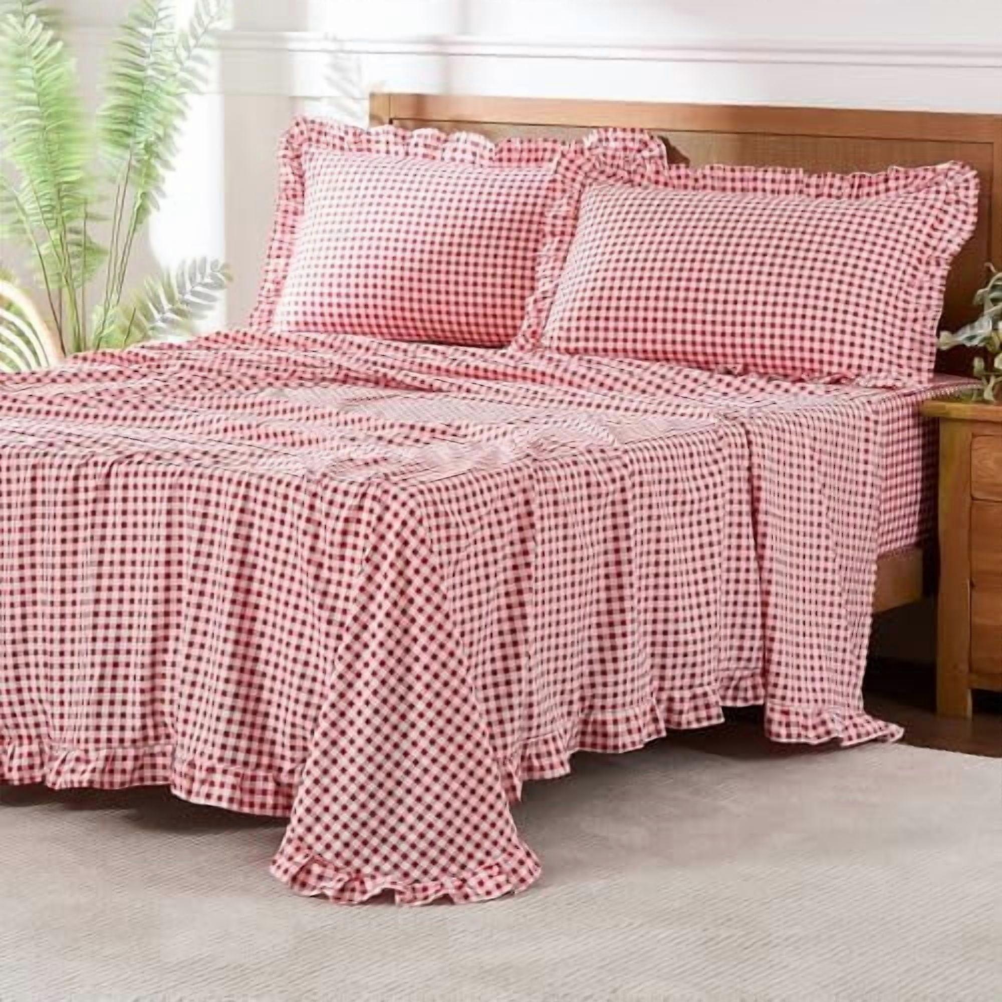 Gingham Sheet Set, Soft Brushed Microfiber Plaid Sheets with 16" Deep Pocket, 4-Piece Ruffle Farmhouse Decor, Queen, Red